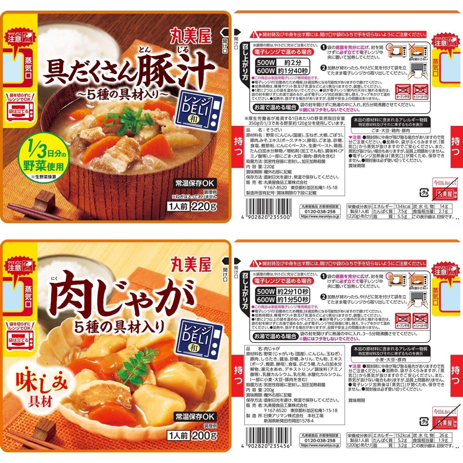 [豚汁]野菜(にんじん(国産)、玉ねぎ、大根、ごぼう)、豚肉、みそ、エキス(ポーク、チキン、酵母)、ごま油、砂糖、食塩、鰹節粉、にんにくペースト、生姜ペースト、鶏脂、たん白加水分解物/増粘剤(加工でん粉)、調味料(アミノ酸等)、(一部にごま・大豆・鶏肉・豚肉を含む)| [肉じゃが]野菜(じゃがいも(国産)、にんじん、玉ねぎ)、豚肉、しらたき、醤油、砂糖、みりん、でん粉、エキス(ポーク、鰹節、酵母)、食塩、ぶどう糖、たん白加水分解物、還元水あめ、デキストリン/調味料(アミノ酸等)、乳酸カルシウム、乳化剤、水酸化カルシウム、(一部に小麦・大豆・豚肉を含む)| [豚バラ大根煮]大根(中国産、国産)、豚肉、砂糖、醤油、たん白加水分解物、大豆油、エキス(オニオン、昆布)、食塩、ぶどう糖、鰹節粉/乳酸カルシウム、増粘剤(加工でん粉、キサンタン)、調味料(アミノ酸等)、(一部に小麦・大豆・豚肉を含む)| [煮込みハンバーグ]食肉(豚肉、牛肉)、玉ねぎ(国産、中国産)、パン粉、牛脂、ソテーキャロット、ウスターソース、ワイン、ビーフエキス調味料、砂糖、鶏卵、粒状植物性たん白、たん白加水分解物、還元水あめ、ミルポワペースト、米粉、小麦粉ルウ、トマトペースト、香味油、にんにくペースト、チキンエキス調味料、香辛料、食塩、酵母エキス/増粘剤(加工でん粉、キサンタン)、着色料(カラメル、ココア)、調味料(アミノ酸等)、甘味料(甘草)、香辛料抽出物、(一部に卵・乳成分・小麦・牛肉・大豆・鶏肉・豚肉・りんご・ゼラチンを含む)| [麻婆豆腐中辛]豆腐(国内製造)、鶏肉、長ねぎ、粒状植物性たん白、ごま油、豆板醤、砂糖、醤油、にんにくペースト、エキス(チキン、酵母)、生姜ペースト、食塩、りんごペースト、たん白加水分解物、発酵調味料/増粘剤(加工でん粉、増粘多糖類)、トレハロース、調味料(アミノ酸等)、豆腐用凝固剤、着色料(カラメル、カロチノイド)、香辛料抽出物、(一部に小麦・ごま・大豆・鶏肉・豚肉・りんごを含む)