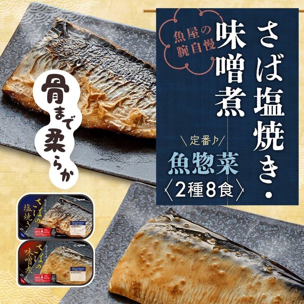 セット内容 : さばの味噌煮(トレイ) ×4/ さばの塩焼き(トレイ) ×4/ 国産乾燥野菜 ×1