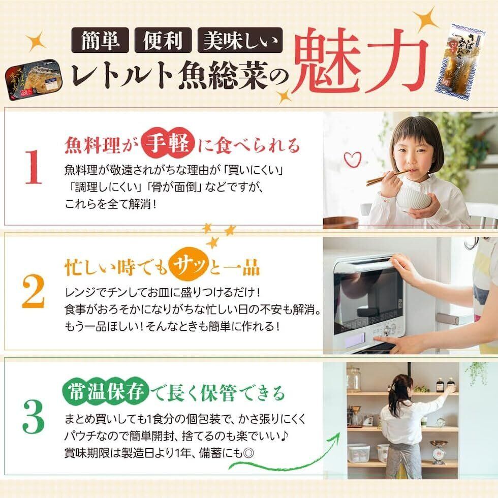 電子レンジ対応 だから パウチ トレイ のまま レンチン で 温めるだけ で 美味しい 魚 料理 が 簡単 手軽 に味わえます。毎日の 食事 の おかず ご飯のお供や 忙しい時の 一品 時短 ごはん に おすすめ です。