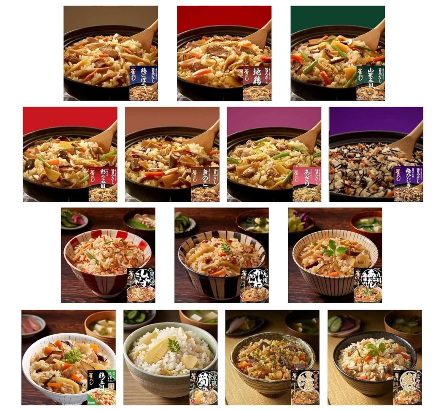 元祖だし炊き釜めしの素7品、減塩釜めしの素1品、ご当地釜めしの素6品をお楽しみいただけます。