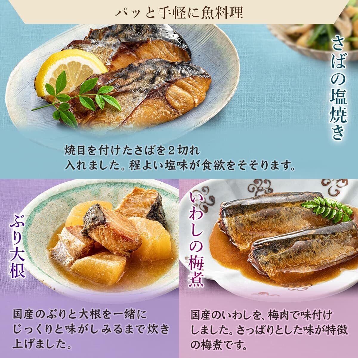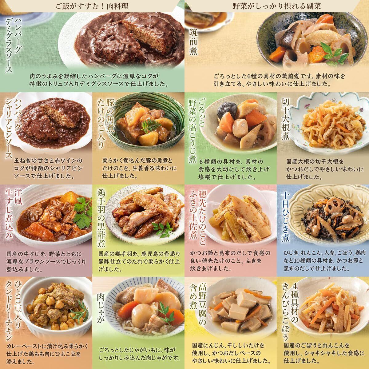 セット内容 : ハンバーグ デミグラスソース ×1/ ハンバーグ シャリアピンソース ×1/ 豚の角煮 たけのこ入り ×1/ 肉じゃが ×1/ さばの塩焼き ×1/ ぶり大根 ×1/ 鶏手羽の黒酢煮 ×1/ いわしの梅煮 ×1/ ひよこ豆入りタンドリーチキン ×1/ 洋風牛すじ煮込み ×1/ 筑前煮 ×1/ 高野豆腐の含め煮 ×1/ 4種具材のきんぴらごぼう ×1/ ごろっと野菜の塩こうじ煮 ×1/ 切干大根煮 ×1/ 穂先たけのことふきの土佐煮 ×1/ 十目ひじき煮 ×1/ 国産乾燥野菜 ×1