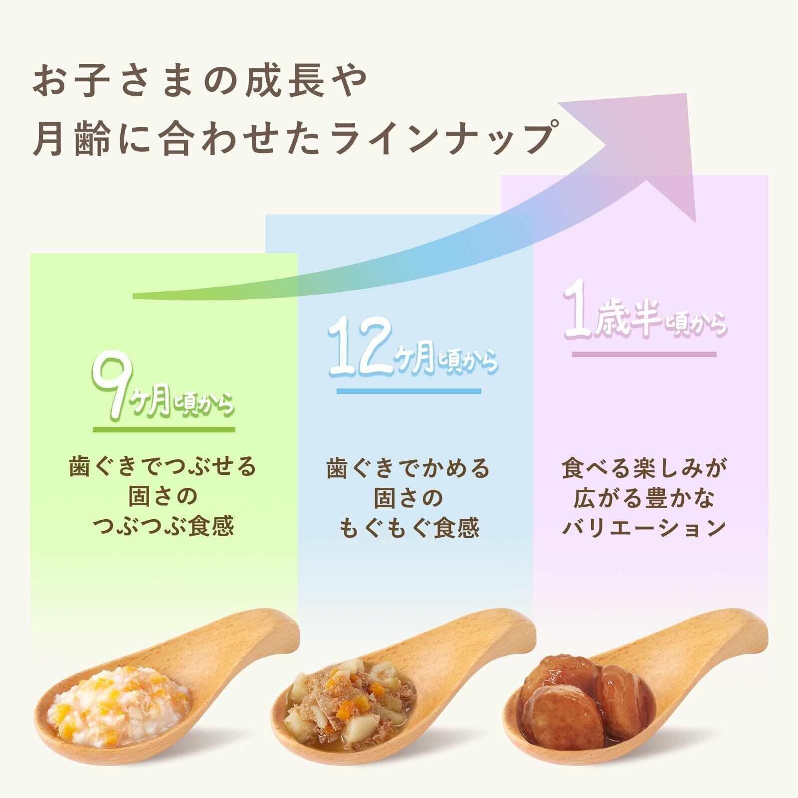 【月齢/形状】12ヶ月頃(離乳食完了期)から/歯ぐきでかめるかたさのもぐもぐ食感