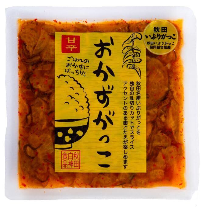 【商品詳細】●秋田名物のいぶりがっこを食べやすい大きさに乱切りカットし、細切り昆布を加え、鰹節風のタレで味付けした『おかずがっこ 甘口』です。