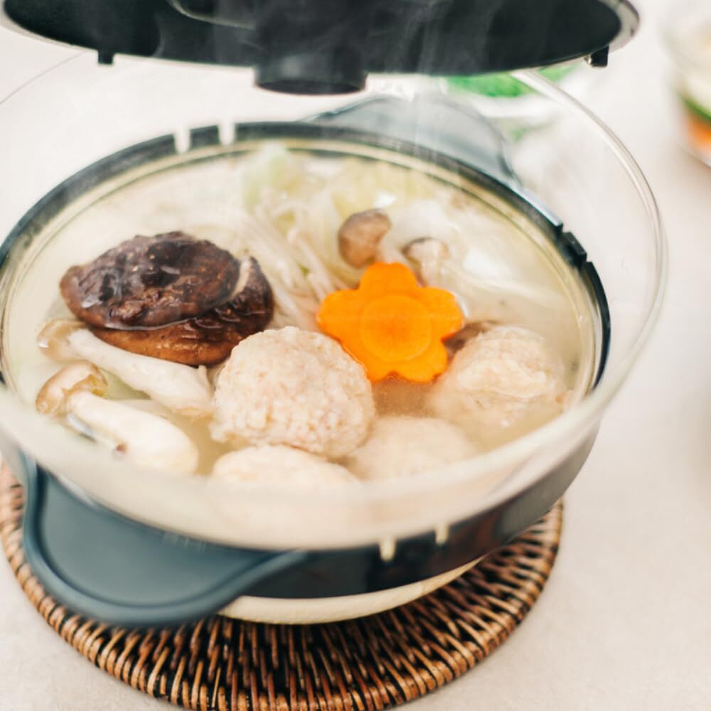 【ガラスのレンジおかず鍋】 野菜やお肉を入れて電子レンジ加熱するだけで、簡単ひとり鍋の完成です。いろいろな食材が食べられるので、栄養バランスが気になるときにもおすすめ。