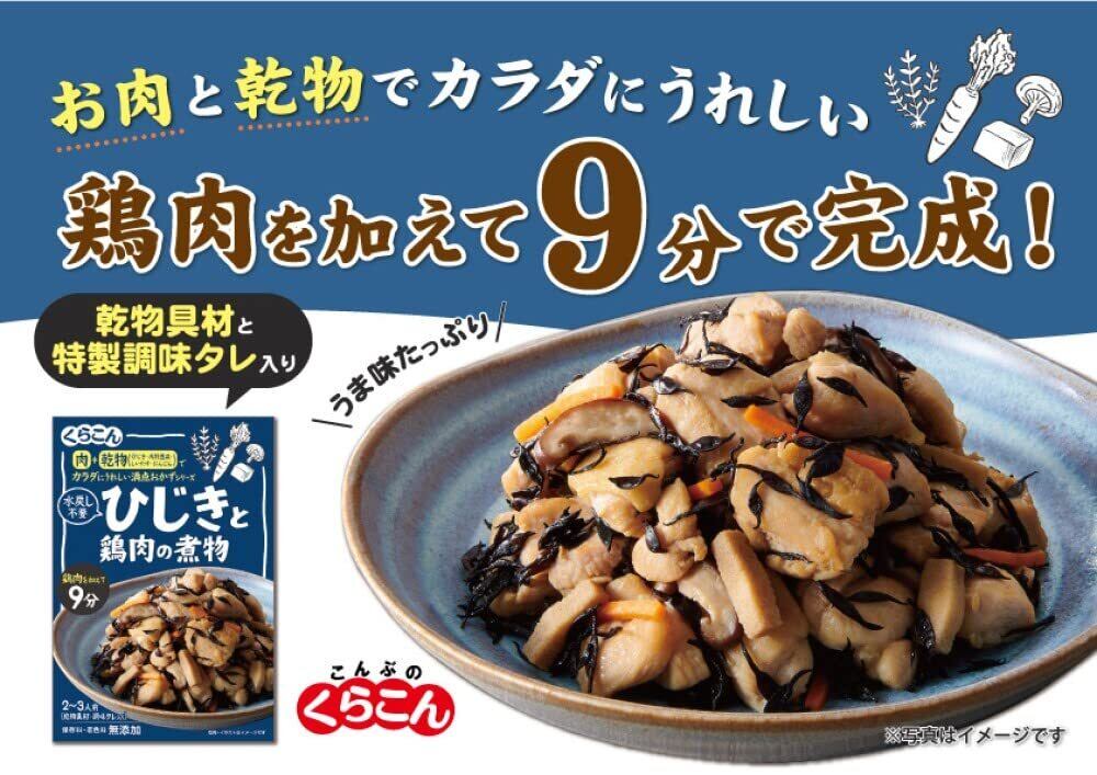 クイック乾物食品のパイオニアとして開発。ひじきの面倒な水戻しが一切不要で、お肉を加えて短時間煮るだけで、簡単に本格的なおいしい和風惣菜ができあがります。鶏肉のうま味がひじきと高野豆腐とからみ合い、甘口のだし醤油がご飯にとても合うおいしさです。乾物が苦手なお子様でもおいしく食べられ、栄養バランスの良い食生活を応援します。また、うま味の強いタレがたっぷりのため、色々な食材と合わせてアレンジして召しあがれます。