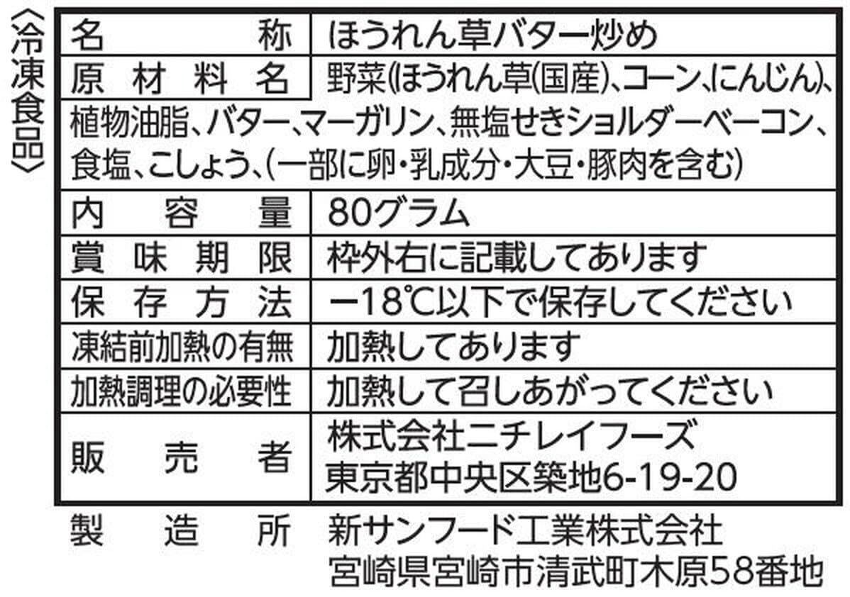 野菜(ほうれん草(国産)、コーン、にんじん)、植物油脂、バター、マーガリン、無塩せきショルダーベーコン、食塩、こしょう、(一部に卵・乳成分・大豆・豚肉を含む)
