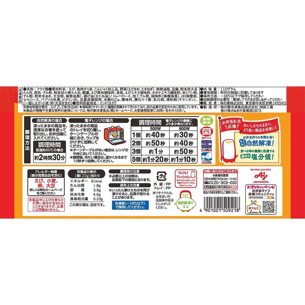 小ぶりな天然エビと、枝豆などの野菜をふんわりとしたすり身とあわせ、パン粉でうすく包んで揚げた、勾玉の形をしたお弁当用のフライおかずです。エビのプリッとした食感が楽しめる軽い食感がうれしく、かわいい形をしているので、お弁当を華やかにするメインのおかずになります。自然解凍でも調理可能です。