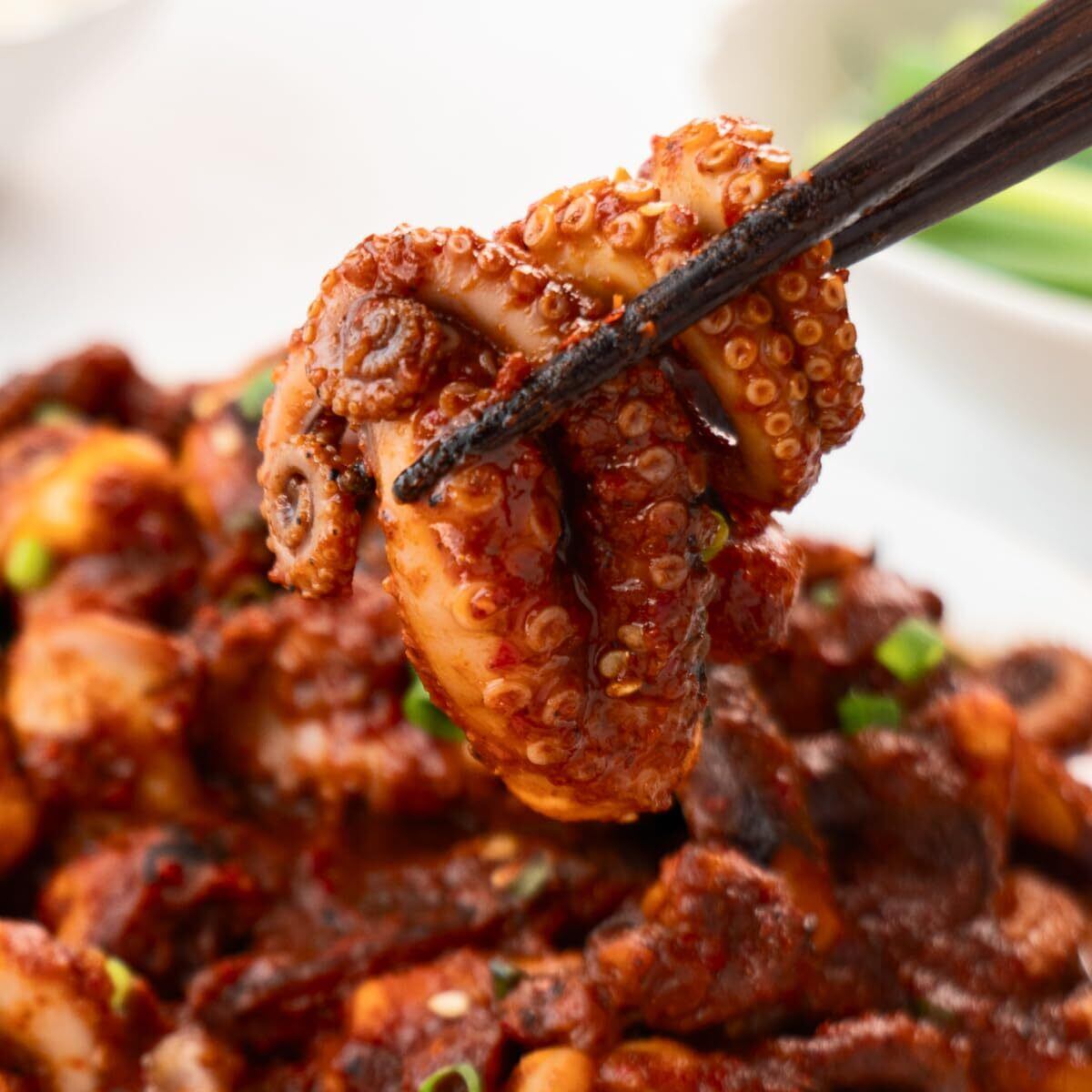チュクミとは?: 「チュクミ」とは韓国語でイイダコのこと。本場では炒める意味の「ポックム」と合わせ「チュクミポックム」と呼ばれる韓国定番の激辛炒め料理です。