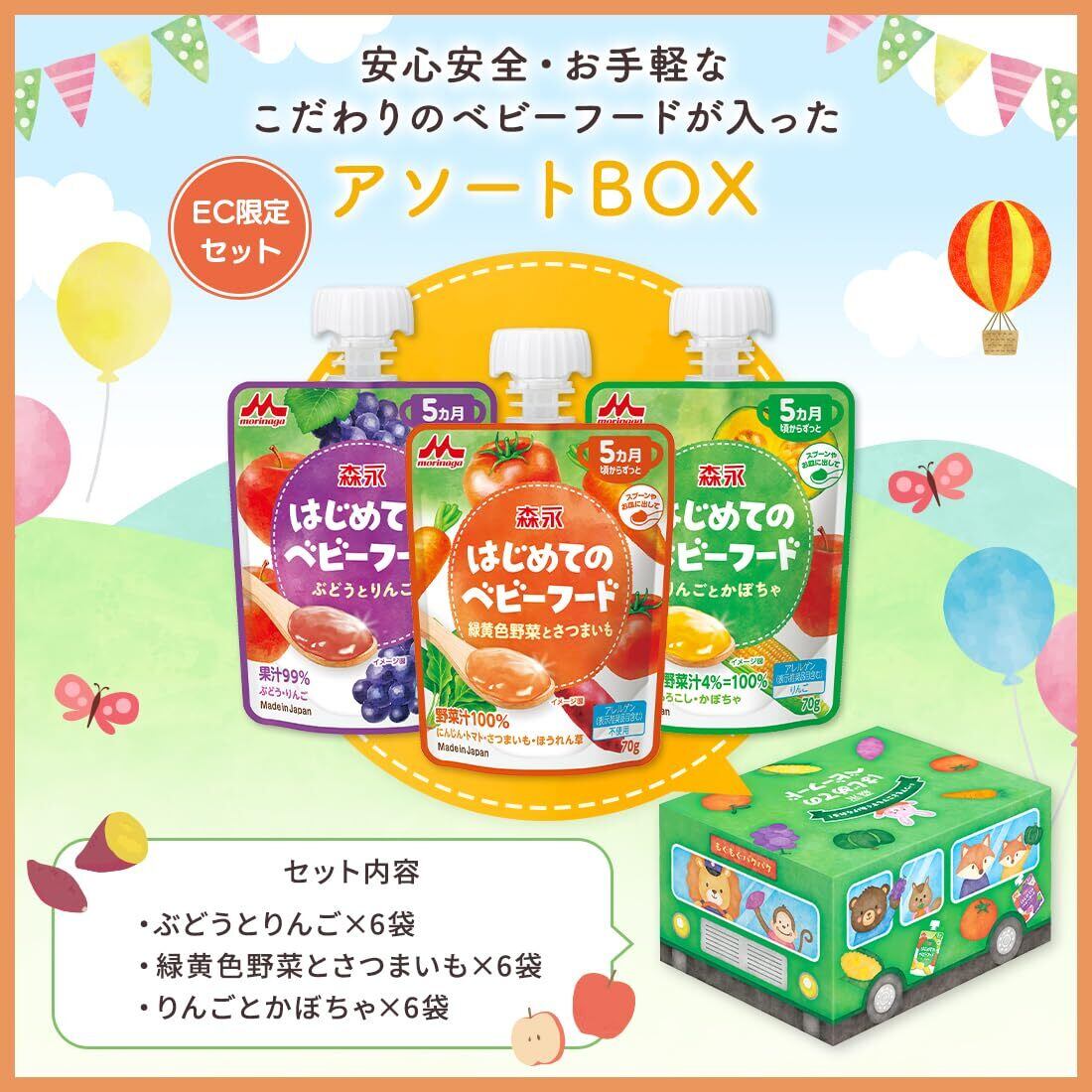 いつでもどこでもすぐあげられる!素材本来のおいしさにこだわったベビーフードのアソートセットです。 はじめてのベビーフード3品種が6袋ずつ、合計18袋入っています。 育児に関わるすべての人に活力を与えるような、わくわくするボックスに入った状態でお届けします。
