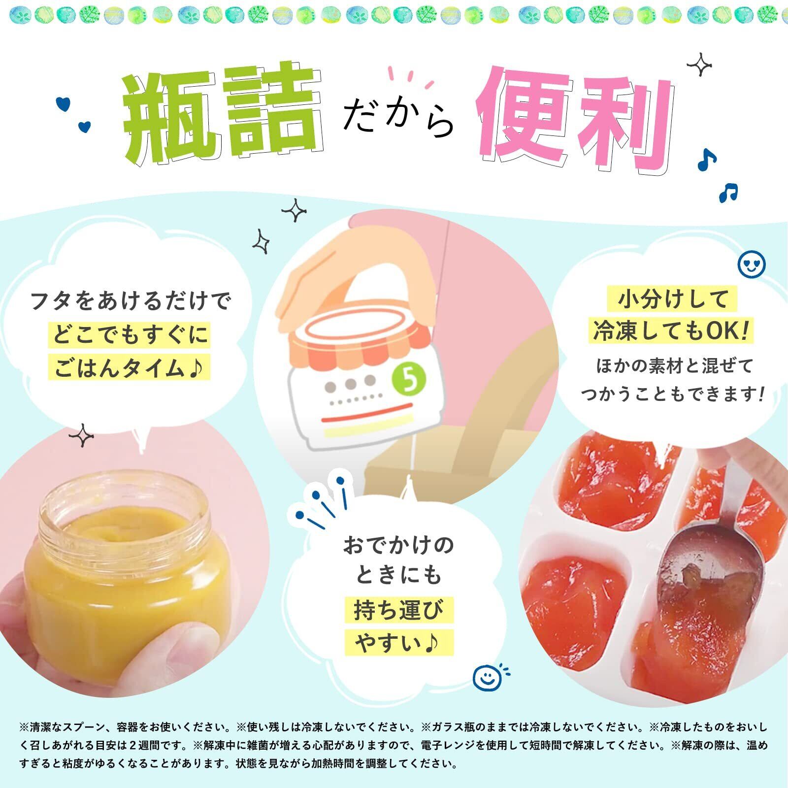 電子レンジをご使用の際は、別の容器にとり、ラップをかけて温めてください。ラップを取る際は、熱くなった中身がはねることがありますので、ご注意ください。過加熱は発火・発煙の恐れがありますので、ご注意ください。お子さまにあげる前に温度を確かめてください。野菜の水分や成分が分離・沈殿することがありますが、品質には問題ありません。着色料・保存料・香料は使用していません。食べる分量を別の容器にとり、残りはキャップをして冷蔵庫(1度~10度)に入れ、その日のうちにお使いください。必要な分量に小分けし、冷凍保存できます。