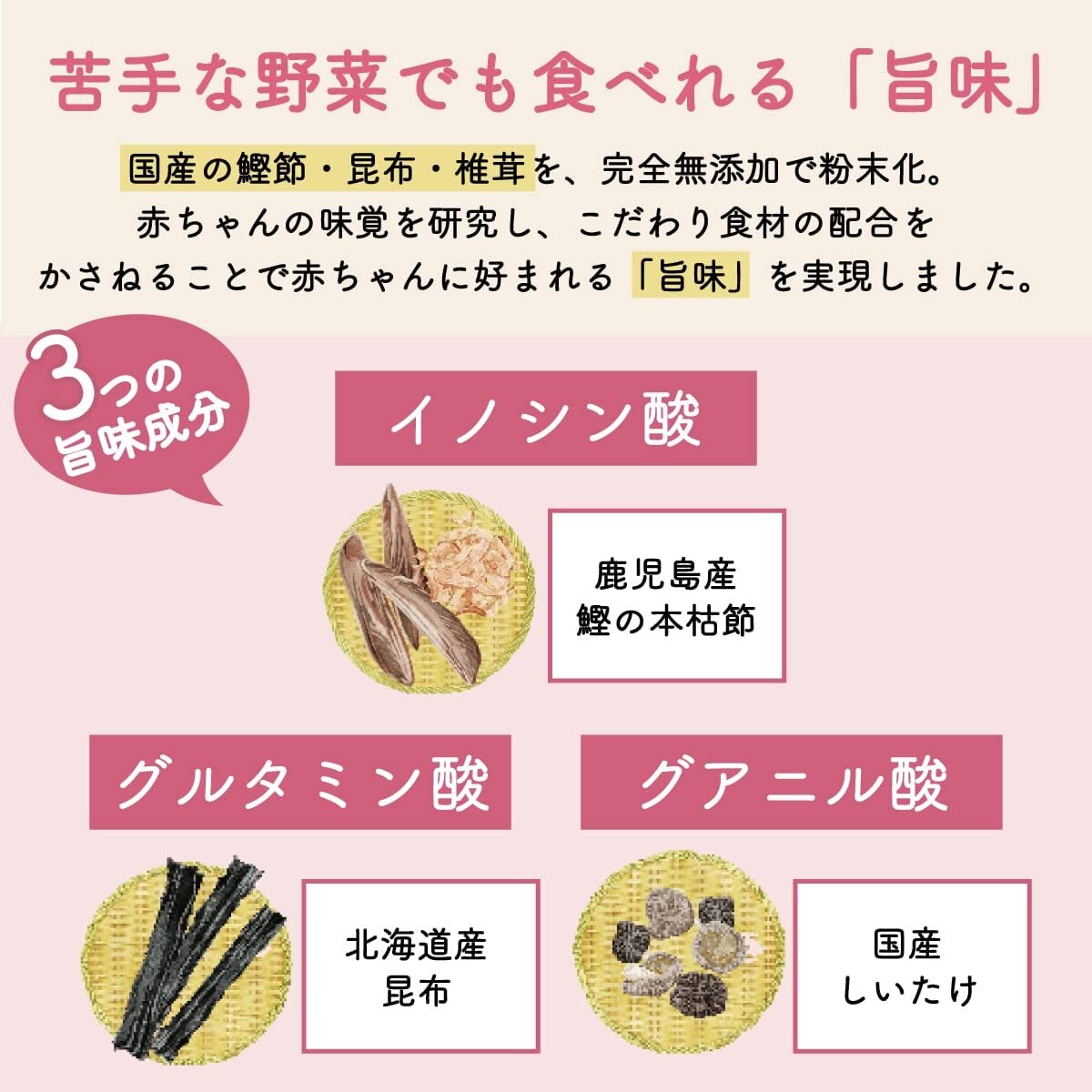 国産の鰹節、昆布、椎茸を完全無添加で粉末化。こだわり食材の配合を重ねることで赤ちゃんに好まれる「旨味」を実現しました。