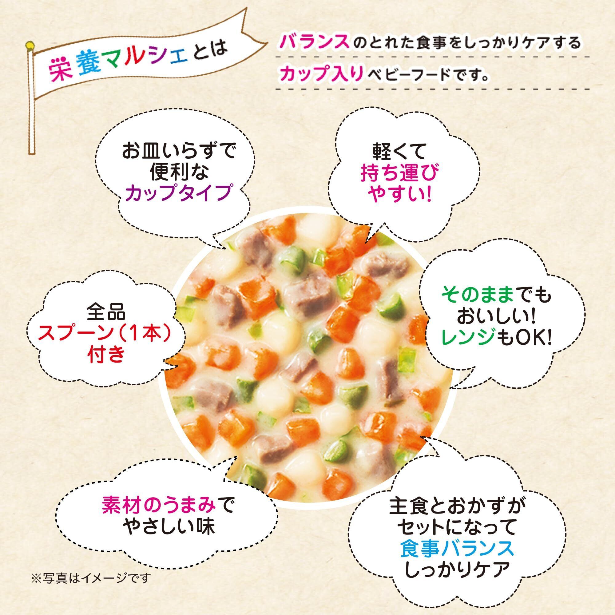 忙しいママの代わりにバランスのとれた食事をしっかりケアする"栄養マルシェ"シリーズです。1歳からのお出かけにも便利! 大満足のたっぷりサイズ。お皿いらずで便利なカップタイプ。容器はそのまま食器として使え、さらに使い捨てのスプーン付き。具の野菜は100%国産です。7大アレルゲン不使用商品は全10品のうち4品。