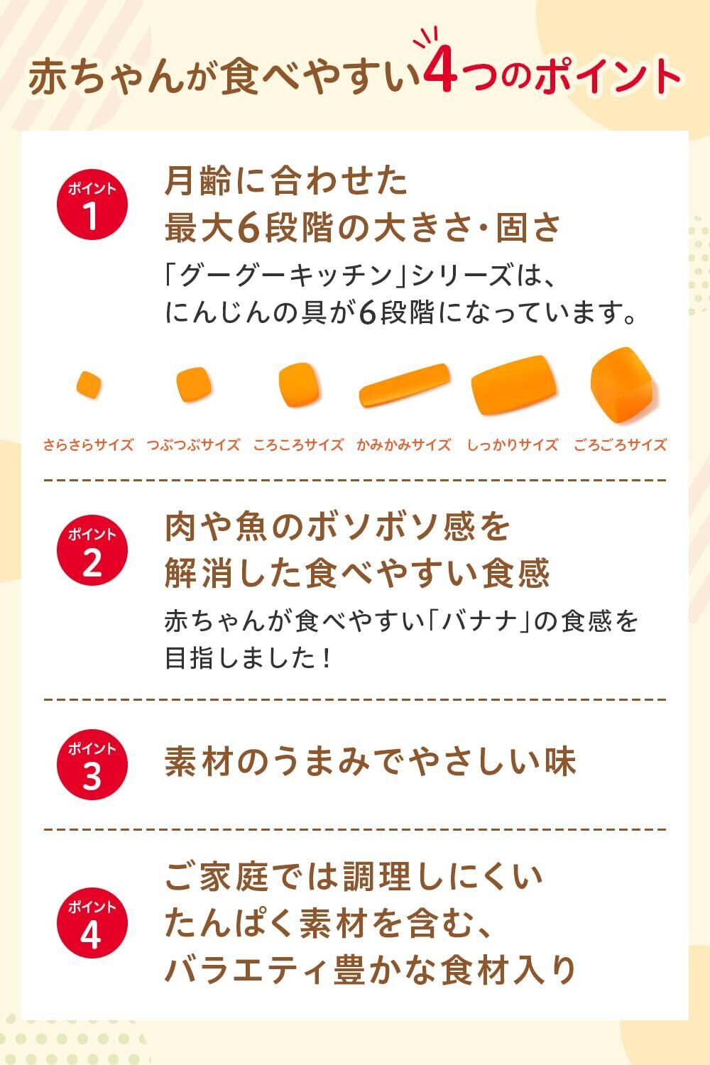 ●この商品はレトルトパウチ食品です。○レトルトパウチ食品は、加圧加熱殺菌を行うことで、常温で長期保存することができます。保存料は使用しておりませんので、開封後は使いきり、食べ残しや作りおきはあげないでください。○月齢は目安です。お子さまの成長に合わせてご使用ください。のどに詰まらせないよう、必ずそばで見守ってください。○離乳のすすめ方については、専門家にご相談ください。 ※たまねぎの薄皮やさやいんげんの筋が口の中に残り、うまくのみこめないことがあります。