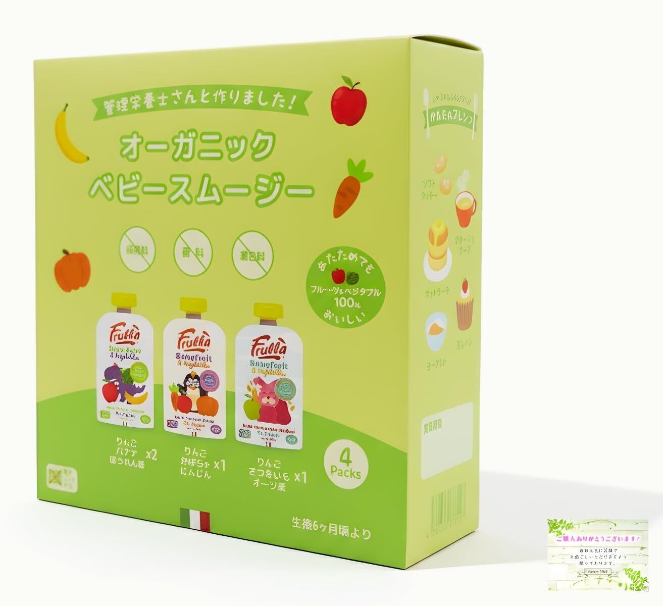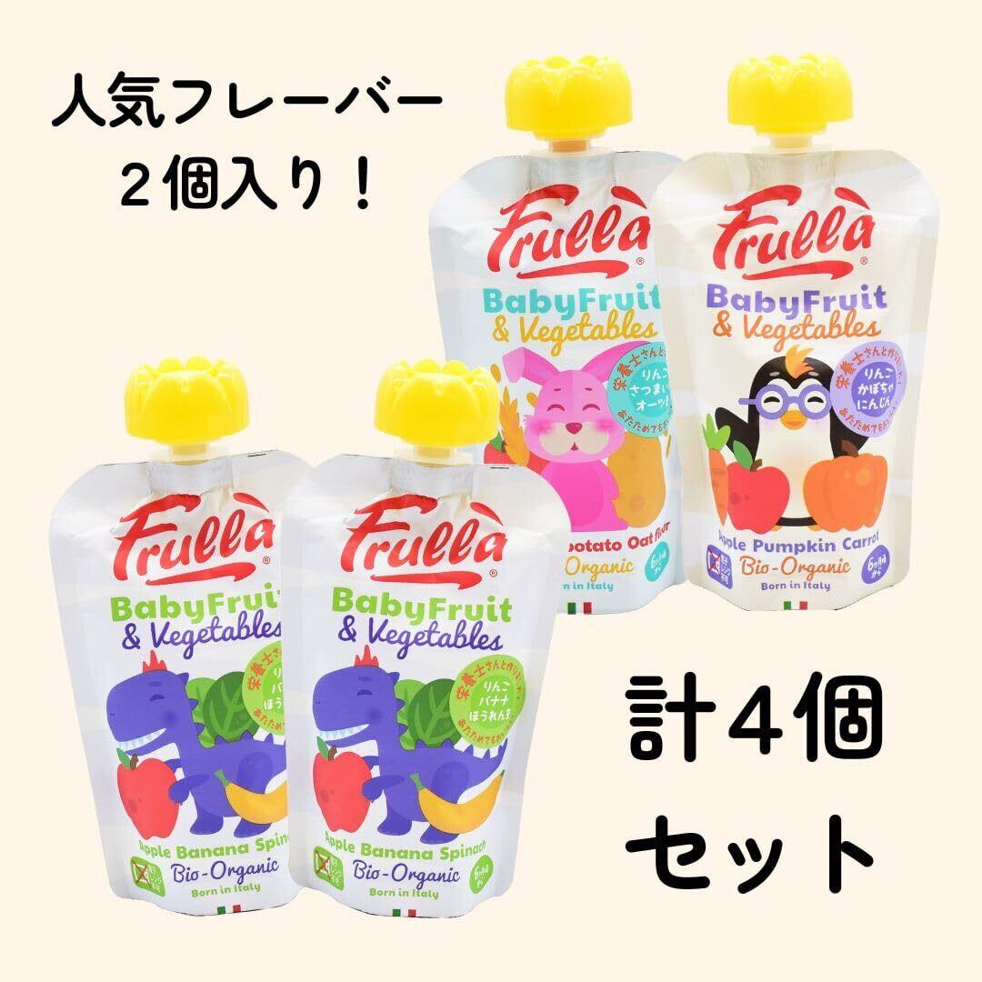 りんご・バナナ・ほうれん草×2個、りんご・さつまいも・オーツ麦×1個、りんご・にんじん・かぼちゃ×1個