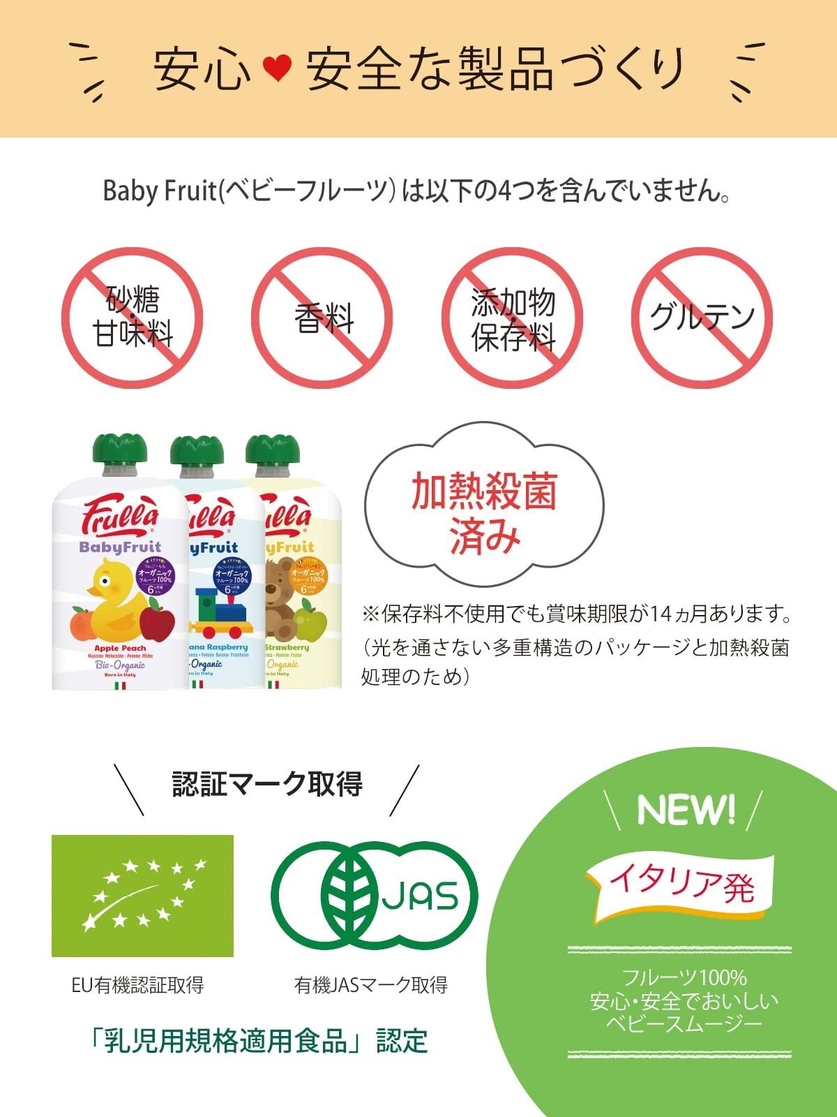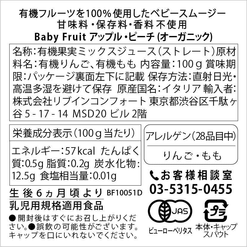 美食の国、イタリアからフルーツ100%・赤ちゃんにやさしいオーガニックスムージーが初上陸!保存料・着色料・砂糖不使用・グルテンフリーで消火にもやさしい。たっぷり100g、フルーツの栄養・水分補給に。持ち運び便利なパウチタイプ、忙しいママの強い味方。