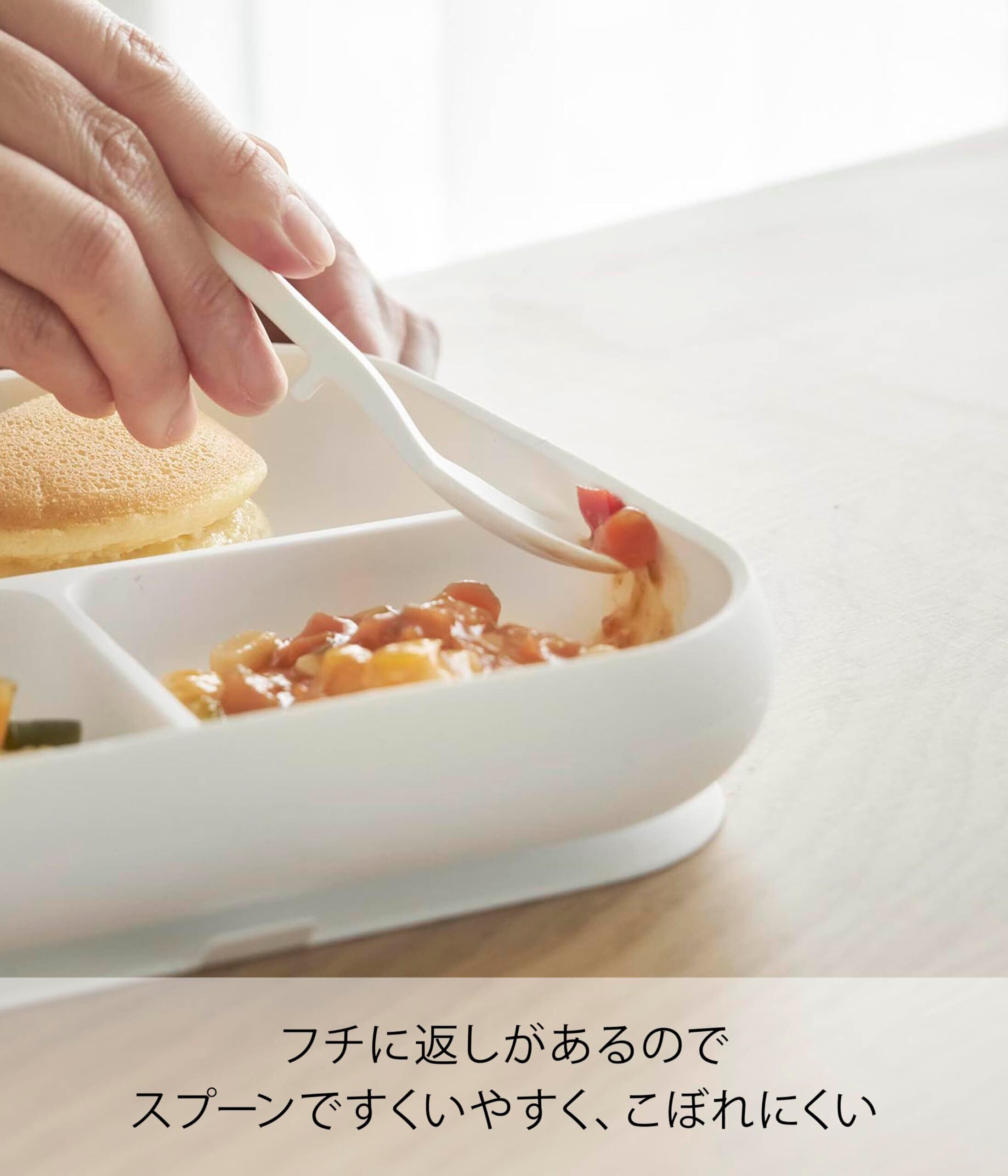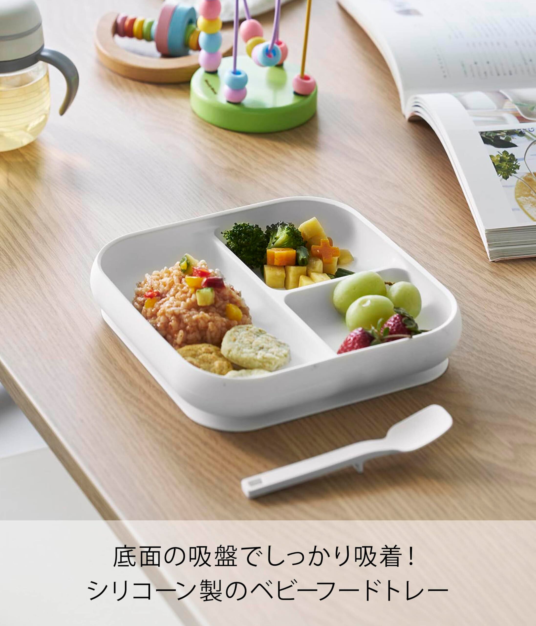吸盤付きで仕切りがあり、トレーのフチに返しがあるのでスプーンですくいやすく、こぼれにくいシリコーン製のベビーフードトレーです。