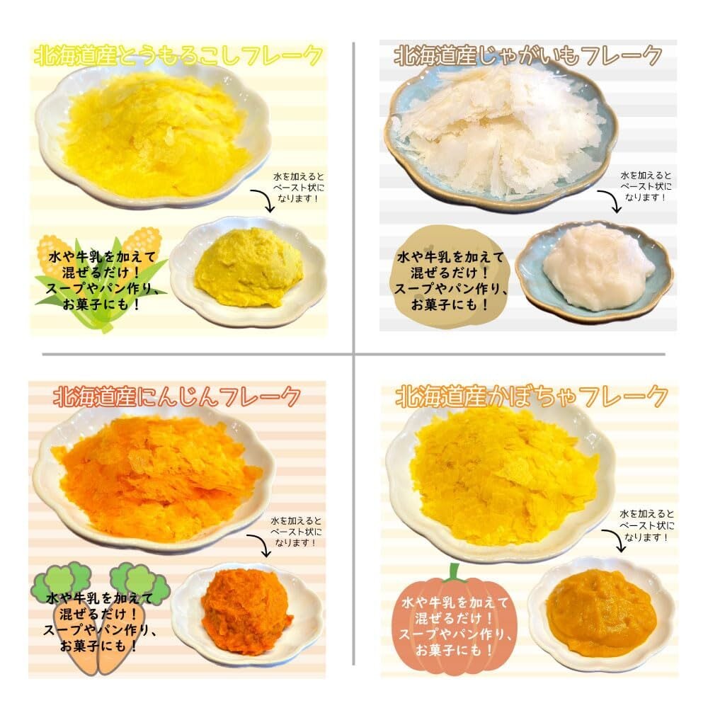 内容量:北海道とうもろこしフレーク 80g、北海道かぼちゃフレーク 80g、北海道にんじんフレーク 65g、北海道じゃがいもフレーク 100g 各1袋 計4袋