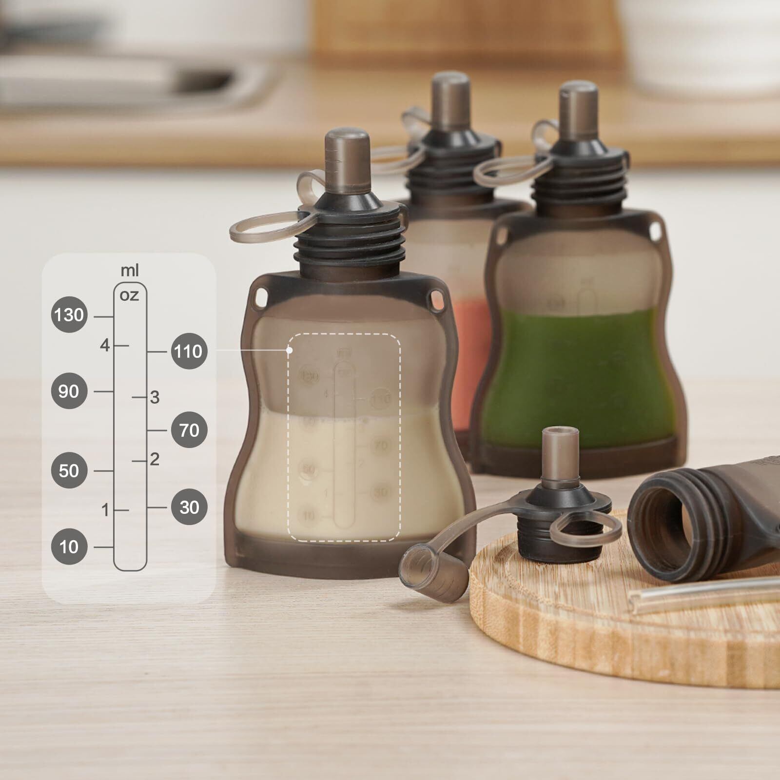 haakaa 再利用可能なベビーフードパウチ 詰め替え可能なドリンクパウチ ヨーグルトパウチ ジュースパウチ スクイーズパウチ 子供用 ベビーフード保存容器、フリーズセーフ、6m以上、4.4オンス/130ml、4個パック