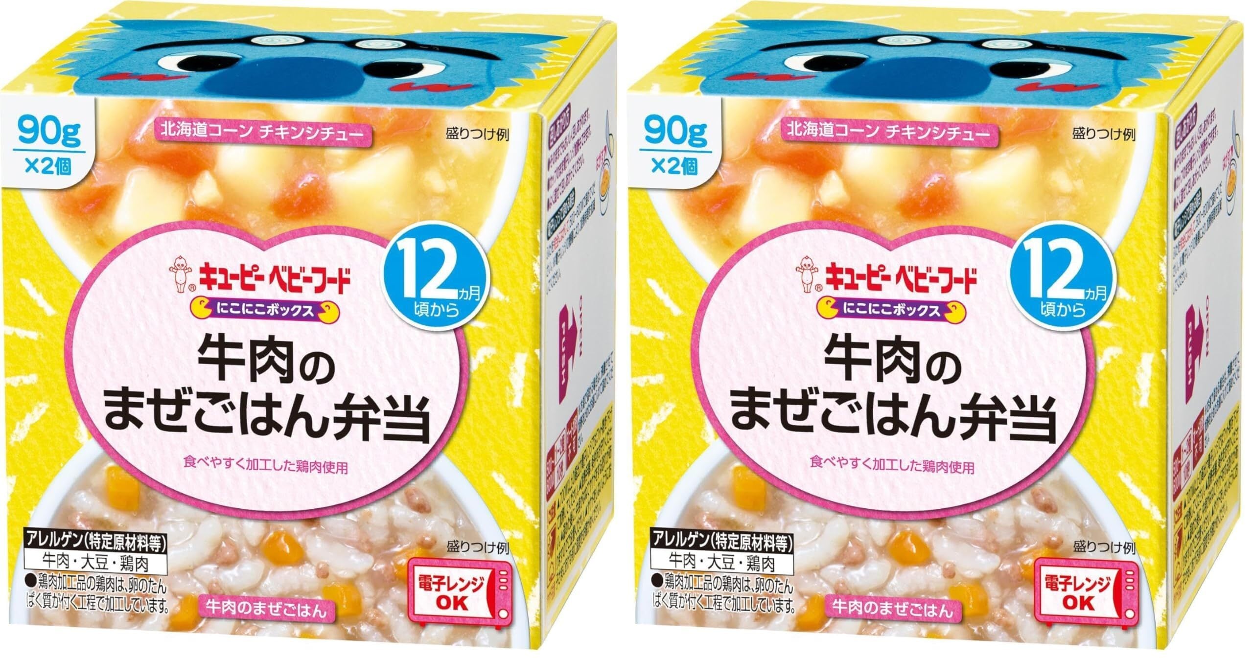 北海道コーンチキンシチュー:野菜(じゃがいも(国産)、とうもろこし、にんじん、たまねぎ)、鶏肉加工品(鶏ささみ、じゃがいもでん粉、食塩)、コーンスターチ、砂糖、チキンエキス、食塩 牛肉のまぜごはん:米(国産)、野菜(たまねぎ、にんじん、ごぼう)、コーンスターチ、牛そぼろ、しょうゆ(大豆を含む)、かつお節合せだし