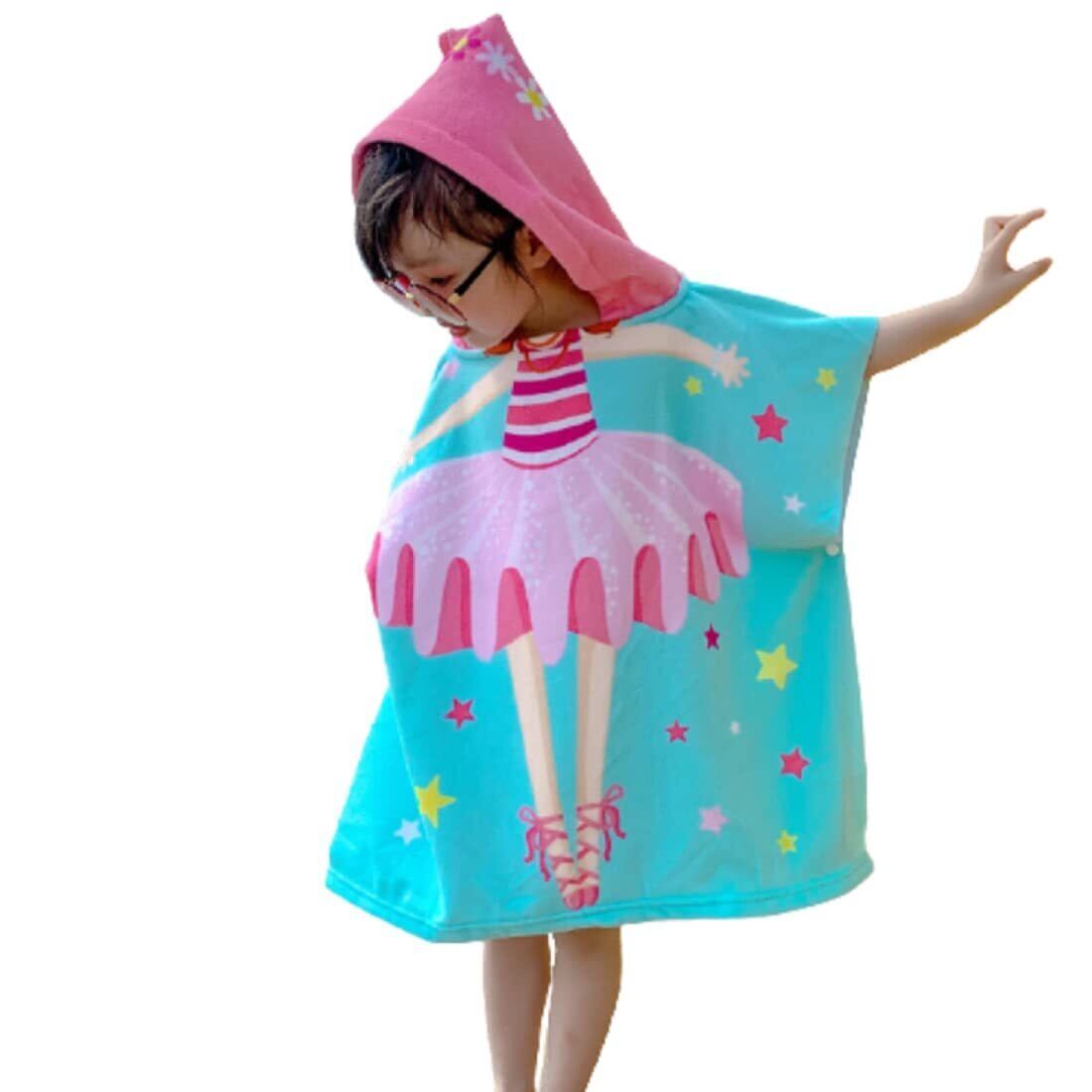 【バスポンチョ】 ふわふわなマイクロファイバー生地で全身を 包みます。お風呂上りや海水浴 プールなどではバスタオルとして体を拭けるので、重宝します。フード付きなりきりポンチョです。 人魚姫 バレリーナとお子様も気分よく楽しく使用できると思います。 【いろいろなシーンで】可愛いデザインでお風呂上り、スイミングや、水遊びのあとなど お昼寝時にスリーパーとして、御自宅用、またはご出産祝いやギフトやプレゼントなどにも実用的で最適な贈り物です。