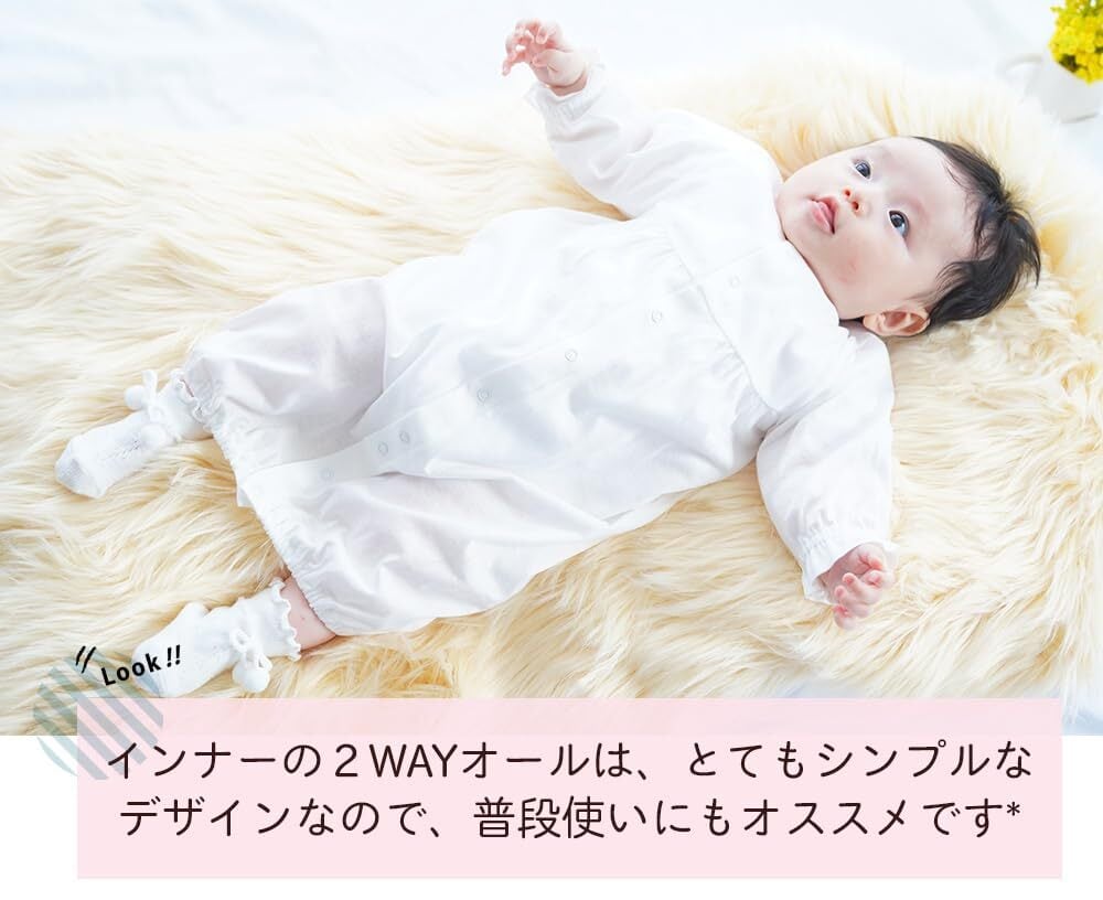 上品な刺繍入りのオーガンジー ロングコートのドレスです。お宮参り・セレモニーなどの晴れの舞台で着せてあげたいベビードレス!オーガンジーコートは長袖ではございません。肩部分からの長めのフリルが付いています。背中部分に2箇所、ボタンがございます。赤ちゃんの退院時は、お帽子とツーウェイオールでOKですね!大切な赤ちゃんの晴れ舞台に・・・。ドレスオールはシンプルなデザインなので、お出かけ用・お披露目のときにも活躍してくれそうですね。
