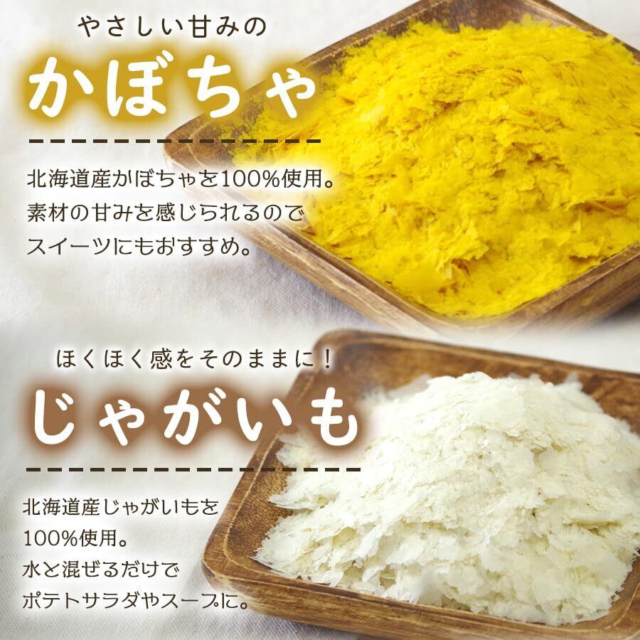 完全無添加。野菜パウダ。北海道産野菜を100%使用した国産野菜フレーク 80gX4種をセットでお届け。かぼちゃフレーク / とうもろこし フレーク / にんじん フレーク / じゃがいも フレーク 。