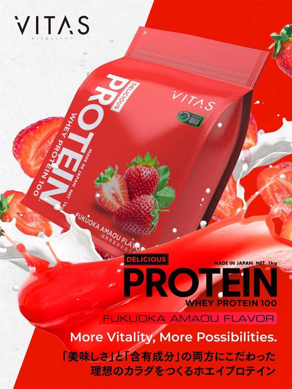 【VITAS デリシャスプロテイン 福岡県産あまおう風味 】美味しさ、溶けやすさ、成分にとことんこだわったプロテイン。厳選された乳清たんぱくを使用。毎日の栄養補給に最適で、トレーニングや美容をサポートします。