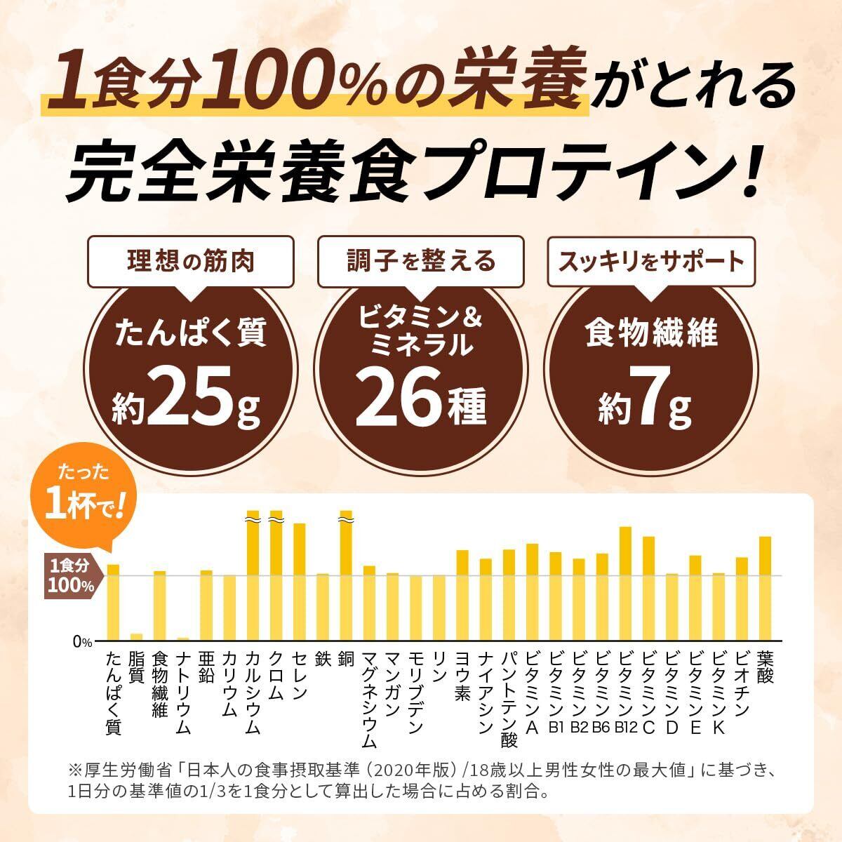 【必要な栄養これ1杯で|完全食】1杯でたんぱく質、ビタミン&ミネラル26種、食物繊維などを加えて「完全栄養食のホエイプロテイン」を実現しました。「たんぱく質で理想の筋肉」「ビタミン&ミネラルで調子を整える」「食物繊維でスッキリをサポート」・【おいしい・溶けやすい・続けやすい価格】こだわり①飲みやすさ・美味しさにこだわり、水で美味しく飲める味わいを実現しました。こだわり②独自の処方で溶けやすさを追求。泡立ちやダマ感、こなっぽさを低減しました。こだわり③毎日飲むものだからこそ、栄養価と続けやすい価格にこだわりました。