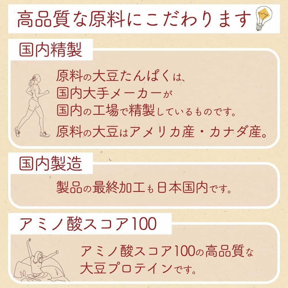大豆臭を抑え、溶けやすくしました。糖類を添加していないため低カロリーですので、カロリー管理されている方におすすめ。また、人工甘味料を気にされる方にもおすすめです。