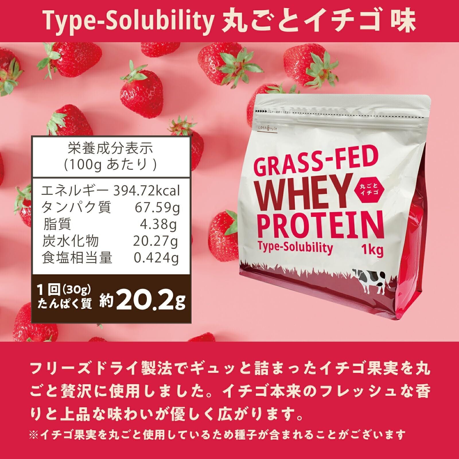 LOHAStyle(ロハスタイル) サッと混ざる グラスフェッド ホエイプロテイン 丸ごとイチゴ味 1kg 人工甘味料不使用 無添加 WPC 牛成長ホルモン不使用