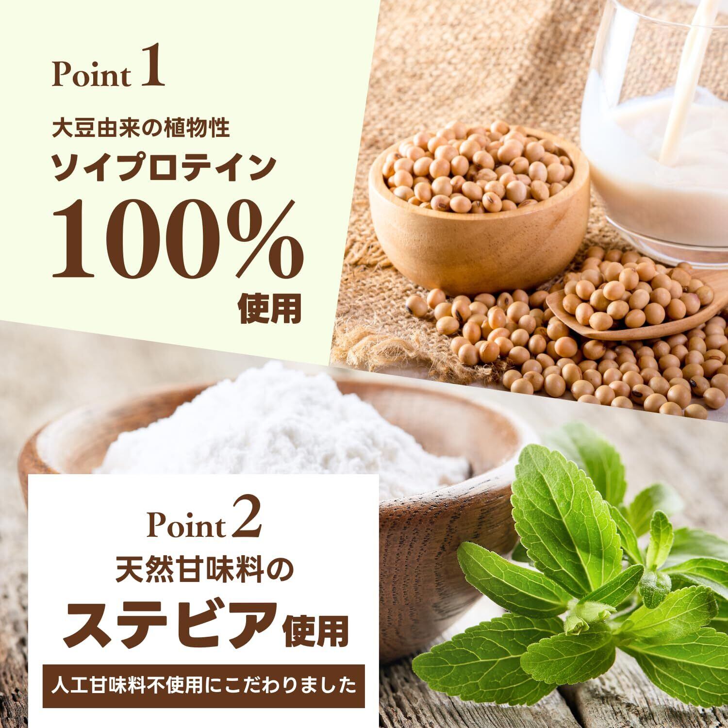 【選ばれる理由】シンプルな原材料で作られた人工甘味料不使用のソイプロテイン。大豆本来の栄養素をそのままに、独自製法で飲みやすさを追求しました。水でもスッと溶け、プロテイン初心者の方でもクセなくスッキリと飲める仕上がりです。