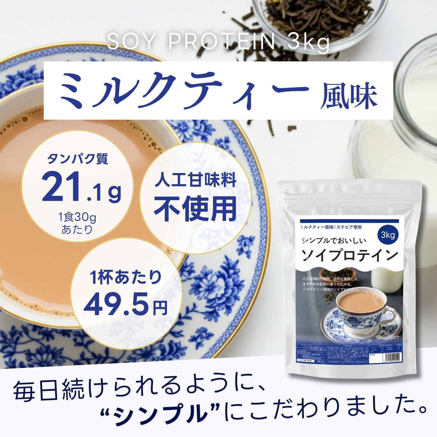 【人工甘味料不使用】ソイプロテイン 3kg ミルクティー風味 シンプルでおいしい ステビア 天然甘味料 国内製造 植物由来 アミノ酸スコア100 大容量 ぷろていん INNOCECT イノセクト
