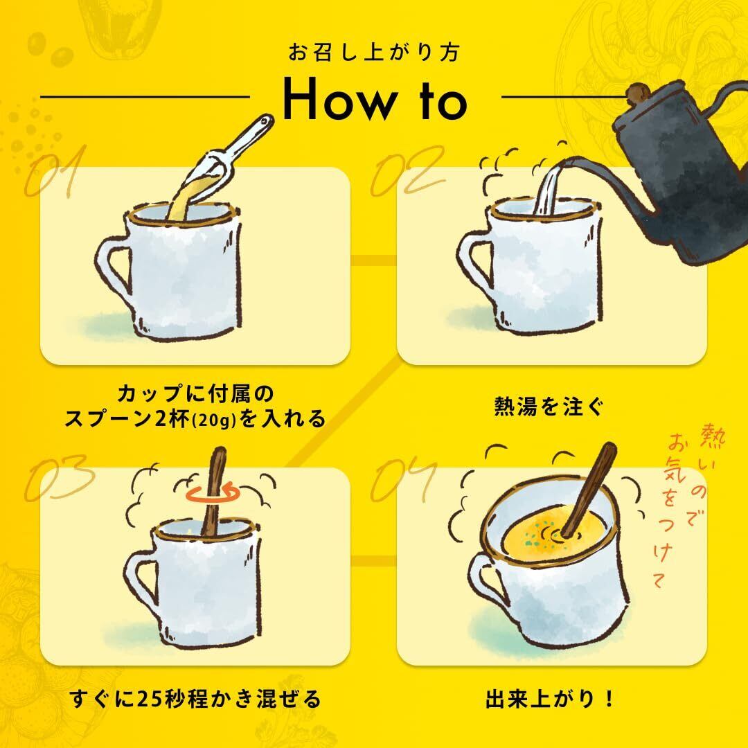 【簡単3ステップで温かいプロテインスープの完成】付属スプーン2杯(20g)を入れて熱湯を注ぎ、25秒かき混ぜるだけで完成。忙しい朝や仕事の合間でも、手軽に温かいプロテインスープをお楽しみいただけます。