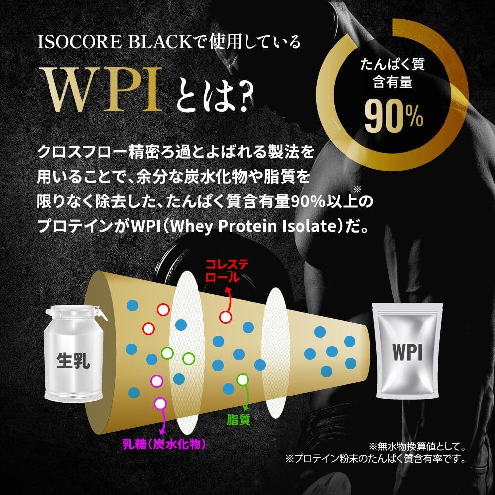 【たんぱく質利用効率サポート①】使用しているプロテインは、吸収が早く特殊製法により余分な炭水化物や脂質を最大限に除去したホエイプロテインアイソレート(Whey Protein Isolate = WPI)。プロテイン原料におけるたんぱく質含有量は約90%だ。