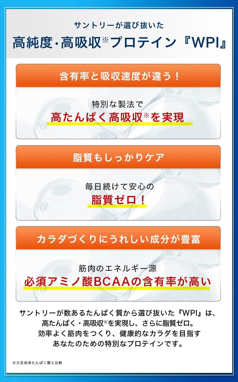 【おすすめする理由1】サントリーが選び抜いた 高機能・高純度プロテイン『WPI』 50代を越えたカラダに必要なたんぱく質は、若者やボディビルダーのためのものとは異なります。また、毎日摂り続けるためには、飲む量やカロリーも気になることでしょう。 そこで、サントリーが数あるたんぱく質から選び抜いた『WPI』は、高たんぱく・高吸収※を実現し、さらに脂質ゼロ。“無理のないカラダづくり”のための、特別なプロテインです。※大豆由来たんぱく質と比較