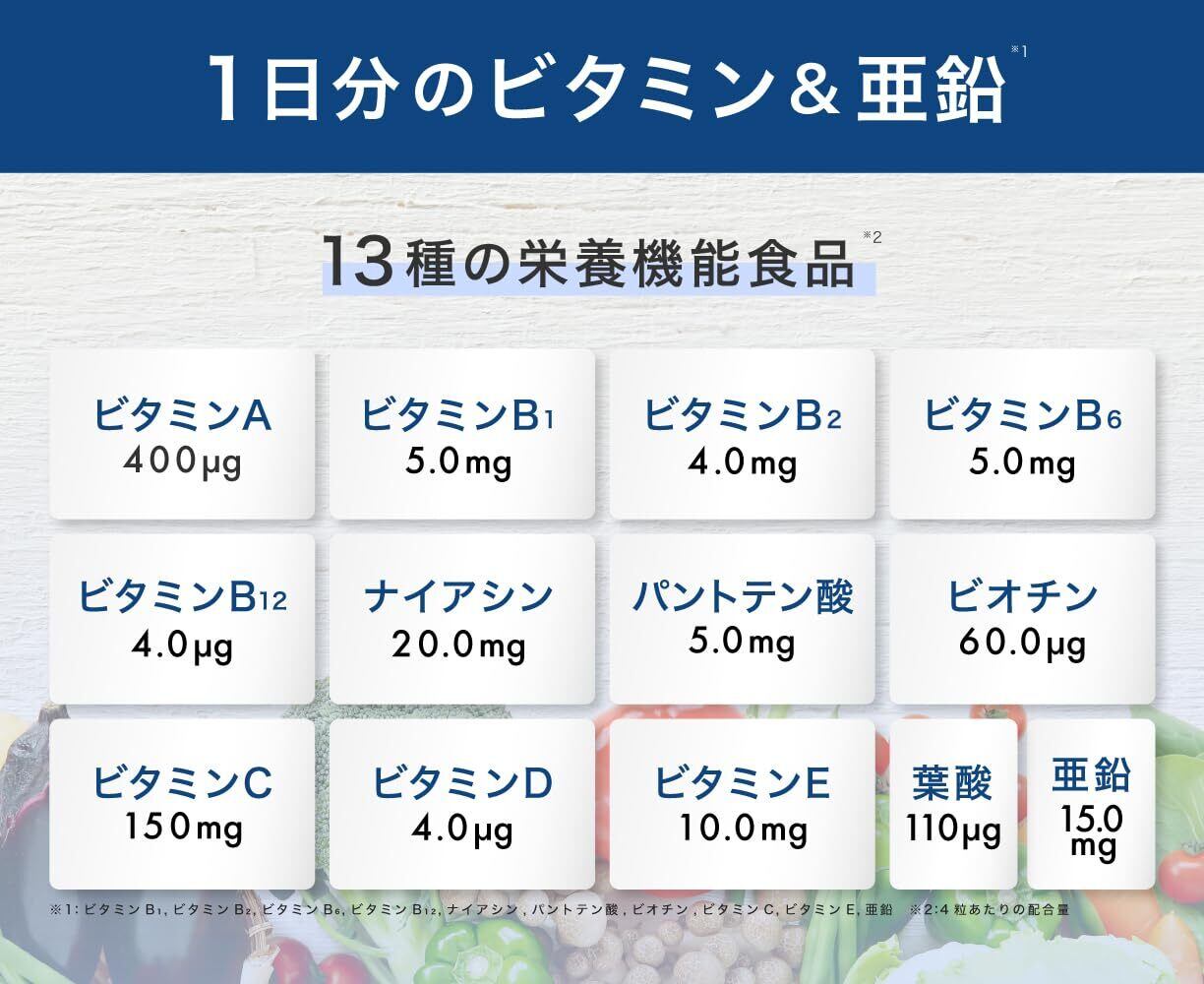 【14種のマルチビタミン】 1日のビタミンを配合。(ビタミンB₁,ビタミンB₂,ビタミンB₆,ビタミンB₁₂,ナイアシン,パントテン酸,ビオチン,ビタミンC,ビタミンE)
