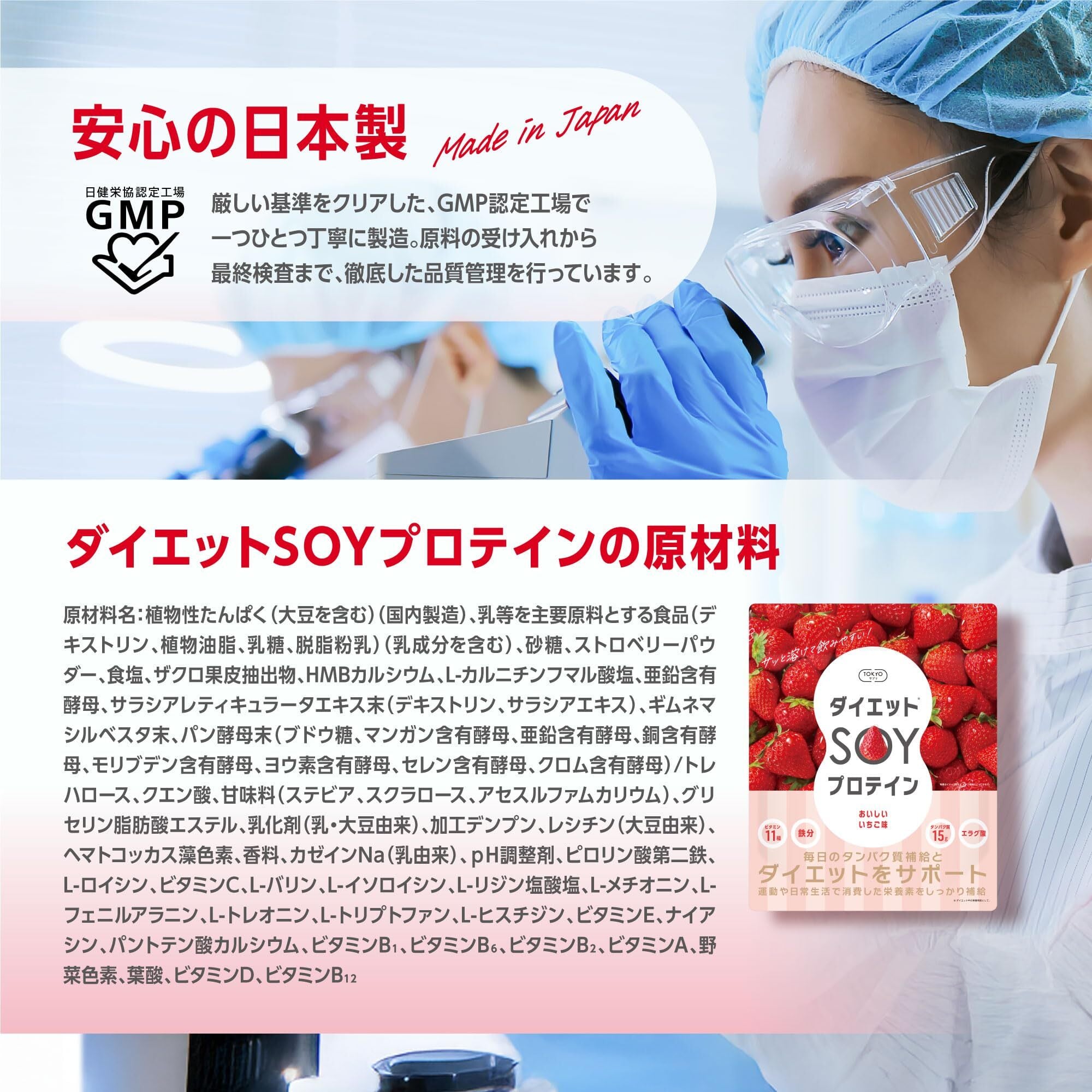 ソイプロテイン 美味しい苺 ダイエット 日本製 タンパク質15g ビタミン11種 鉄分 BCAA EAA 600g GMP認定 TOKYOサプリ