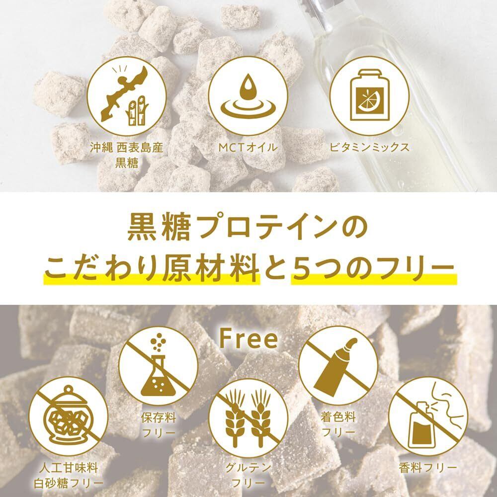 【おいしさへのこだわり】 コクと甘みが特徴の沖縄県西表島産の黒糖のじゃりじゃりとしたザラメの食感が楽しめる珍しいプロテイン。水で溶かしても美味しく、ご褒美感覚で飲める味に仕上げました。水・ミルク・ホットでもお楽しみいただけます。