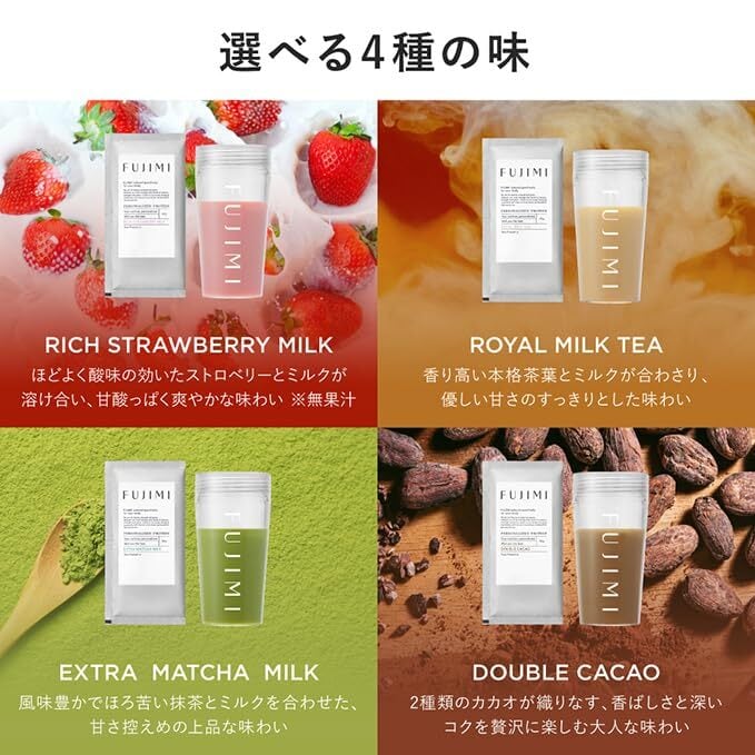 【FUJIMI人気の4味を試せるアソートパック!】 「リッチストロベリーミルク/エクストラ抹茶ミルク/ロイヤルミルクティー/ダブルカカオ」の4味をお試しいただけるセットです。まずは人気のフレーバーからお気に入りの美味しい味を見つけてから購入したい!という方にぴったりです。