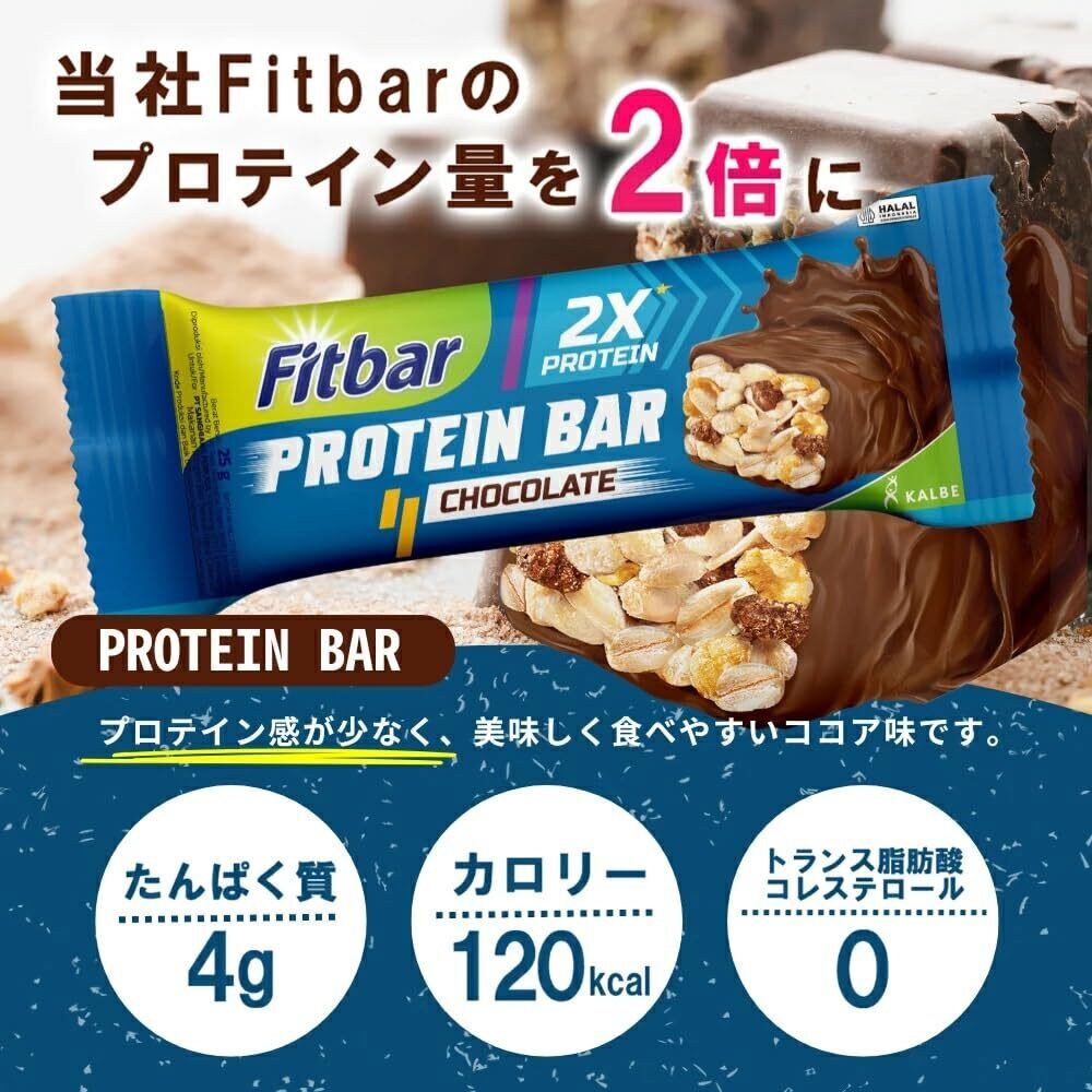 プロテインが通常の2倍配合されたFitbarが新登場 1本あたり120Kcal、コレステロールゼロ、トランス脂肪酸ゼロ 1本25gと食べ応え抜群 HALAL認証のシリアルバー プロテインが通常の2倍配合されたココア味のFitbar ※Fitbarココア味の2倍