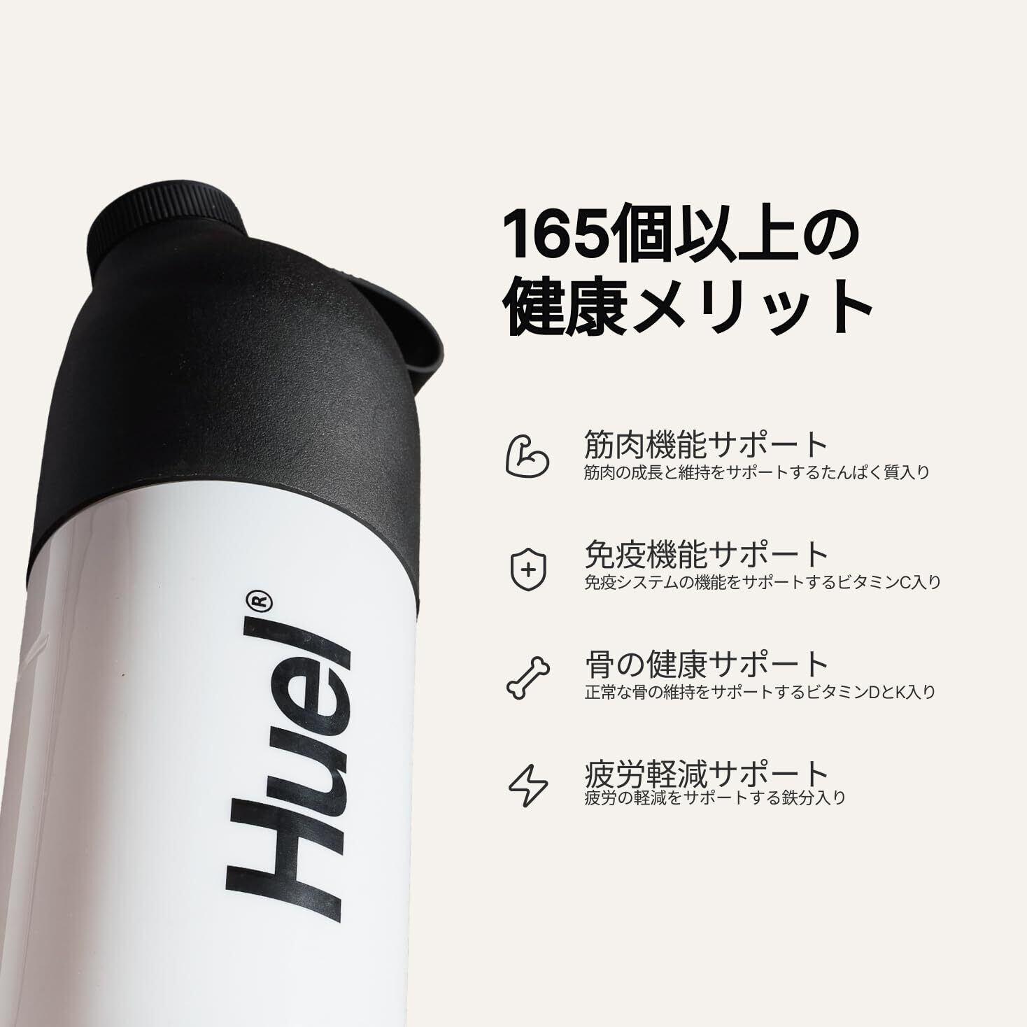 33種類の栄養素配合に加え、26種類の必須栄養素をバランスよく摂取できる「完全栄養プロテイン」! Huelのフードテクノロジーを駆使することで、栄養素独特の苦味やエグみを抑え、おいしさを追求しました。 たんぱく質、脂質、炭水化物の三大栄養素のほか、ビタミン・ミネラル・必須脂肪酸もバランス良く整えました。 水をボトルに入れてシェイクするだけで簡単調理!