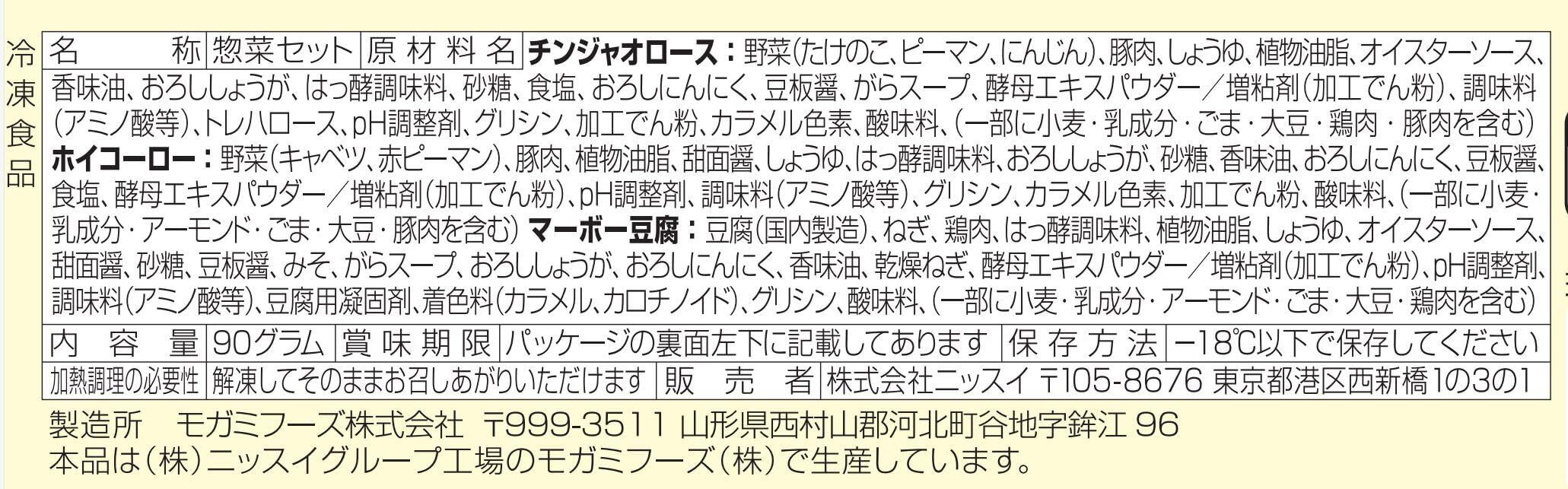 チンジャオロース:野菜(たけのこ、ピーマン、にんじん)、豚肉、しょうゆ、植物油脂、オイスターソース、香味油、おろししょうが、はっ酵調味料、砂糖、食塩、おろしにんにく、豆板醤、がらスープ、 酵母エキスパウダー/増粘剤(加工でん粉)、調味料(アミノ酸等)、トレハロース、pH調整剤、グリシン、加工でん粉、カラメル色素、酸味料、(一部に小麦・乳成分・ごま・大豆・鶏肉・豚肉を含む)ホイコーロー:野菜(キャベツ、赤ピーマン)、豚肉、植物油脂、甜面醤、しょうゆ、はっ酵調味料、おろししょうが、砂糖、香味油、おろしにんにく、豆板醤、食塩、酵母エキスパウダー/増粘剤(加工でん粉)、pH調整剤、 調味料(アミノ酸等)、グリシン、カラメル色素、加工でん粉、酸味料、(一部に小麦・乳成分・アーモンド・ごま・大豆・豚肉を含む)マーボー豆腐:豆腐(国内製造)、ねぎ、鶏肉、はっ酵調味料、植物油脂、しょうゆ、オイスターソース、甜面醤、 砂糖、豆板醤、みそ、がらスープ、おろししょうが、おろしにんにく、香味油、乾燥ねぎ、酵母エキスパウダー/増粘剤(加工でん粉)、pH調整剤、調味料(アミノ酸等)、豆腐用凝固剤、着色料(カラメル、カロチノイド)、グリシン、酸味料、(一部に小麦・乳成分・アーモンド・ごま・大豆・鶏肉を含む)