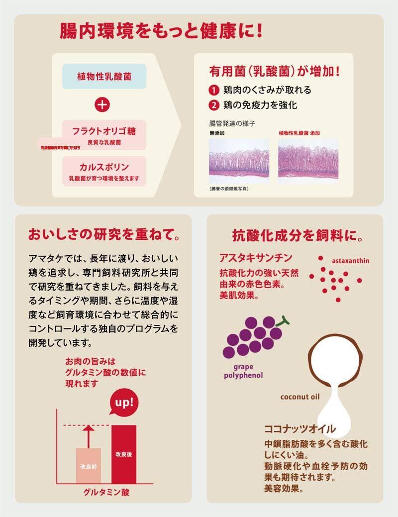 【自然豊かな岩手県の農場で育てた赤鶏使用】一般的なコンビニや量販店で販売されている国産ブロイラー鶏(大量飼育鶏)やタイやブラジルといった外国産鶏とは違いアマタケが生産から飼育、流通まで全てを管理、抗生物質、合成抗菌剤を一切使わず、自然由来の飼料で大切に育てた赤鶏を使用しております。