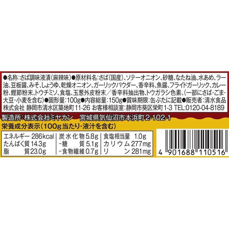 さば(国産)、ソテーオニオン、砂糖、なたね油、水あめ、ラー油、豆板醤、みそ、しょうゆ、乾燥オニオン、ガーリックパウダー、香辛料、魚醤、フライドガーリック、カレー粉、鰹節粉末、トウチミソ、食塩、玉葱外皮粉末/香辛料抽出物、トウガラシ色素、(一部にさば・ごま・大豆・小麦を含む)