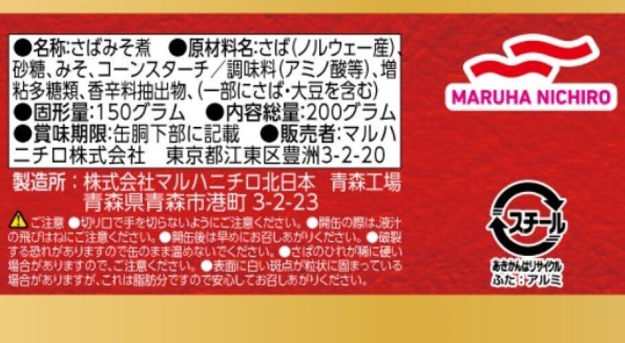 原材料:さば(ノルウェー)、砂糖、みそ、コーンスターチ/調味料(アミノ酸等)、増粘多糖類、香辛料抽出物、(一部にさば・大豆を含む)