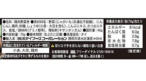 原材料:野菜(じゃがいも(非遺伝子組換)、にんじん)、鶏肉、砂糖、しょうゆ(小麦・大豆を含む)、こんぶエキス、かつおエキス、食塩/調味料(アミノ酸等)、増粘剤(キサンタンガム)