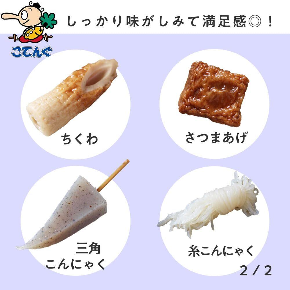 原材料:こんにゃく、大根、うずら卵、ちくわ、さつまあげ、がんもどき、たん白加水分解物、糖類(砂糖、還元麦芽糖、乳糖)、風味原料(鯛エキス、かつおぶしエキス、かつおぶし粉末、こんぶエキス、かつおエキス)、食塩、酵母エキス/調味料(アミノ酸等)、ソルビット、加工デンプン、乳化剤、水酸化Ca、(一部に小麦・卵・乳成分・ごま・大豆・豚肉・ゼラチンを含む)