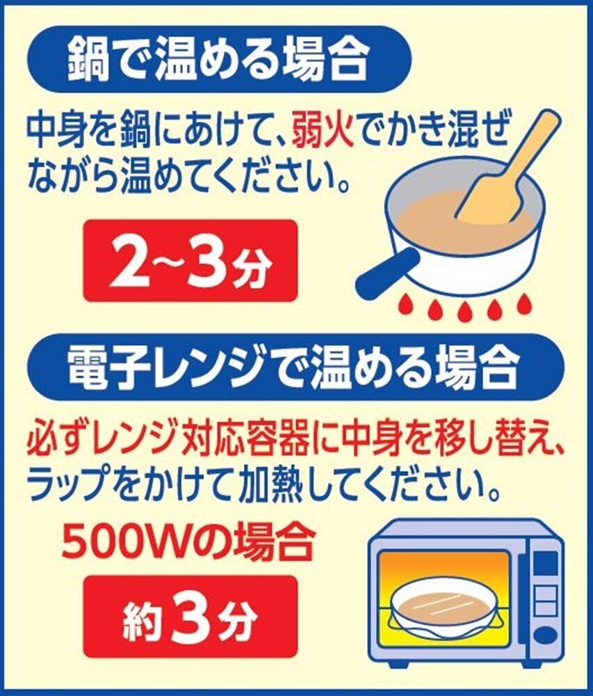 【温め方】中身を鍋にあけて、弱火でかき混ぜながら温めてください。電子レンジの場合は、必ず別容器に移しラップをして温めてください。