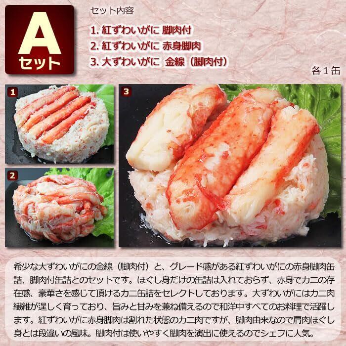 希少な大ずわいがにの金線(脚肉付)と、グレード感がある紅ずわいがにの赤身脚肉缶詰、脚肉付缶詰とのセットです。ほぐし身だけの缶詰は入れておらず、赤身でカニの存在感、豪華さを感じて頂けるカニ缶詰をセレクトしております。大ずわいがにはカニ肉繊維が逞しく育っており、旨みと甘みを兼ね備えるので和洋中すべてのお料理で活躍します。紅ずわいがに赤身脚肉は割れた状態のカニ肉ですが、脚肉由来なので肩肉ほぐし身とは段違いの風味。脚肉付は使いやすく脚肉を演出に使えるのでシェフに人気。
