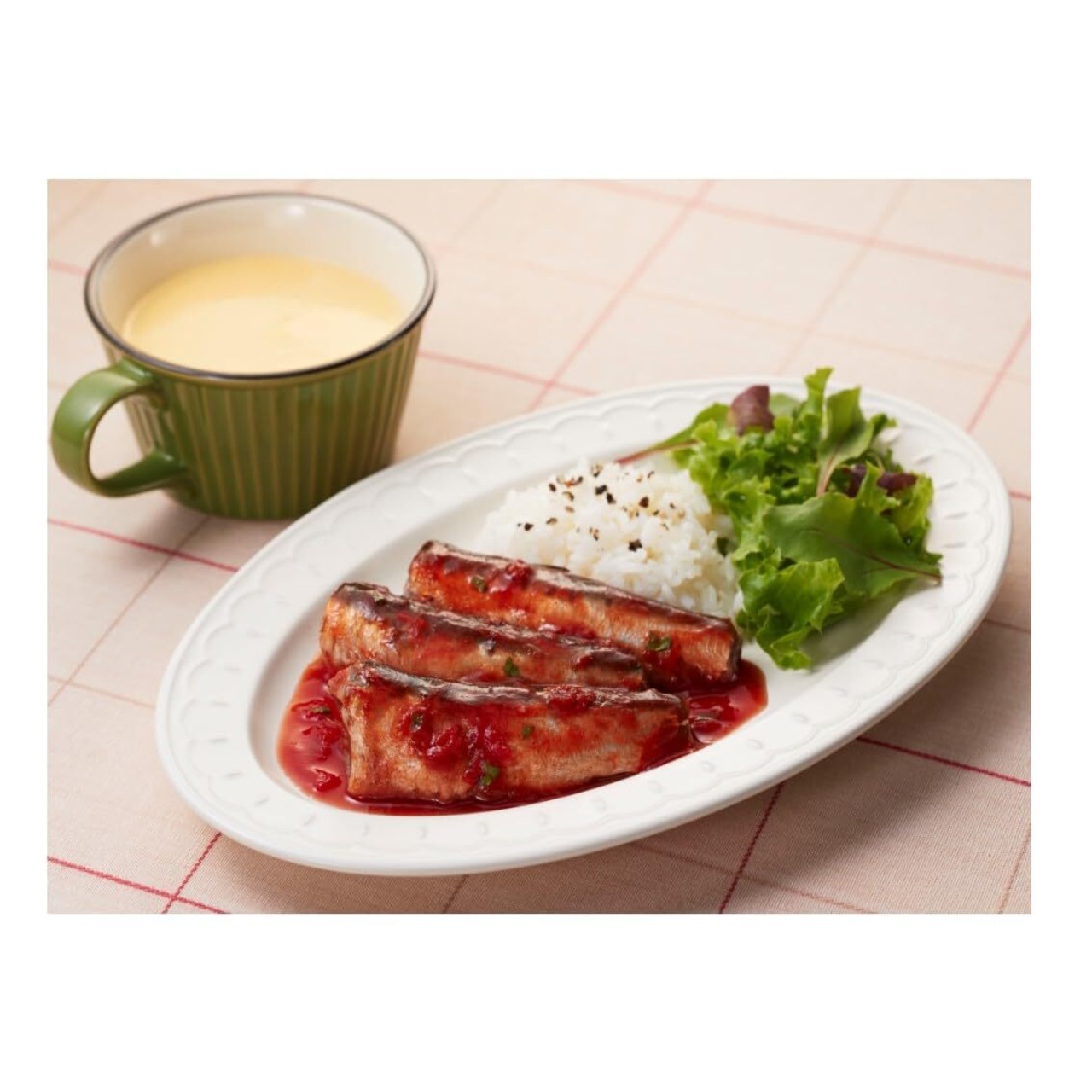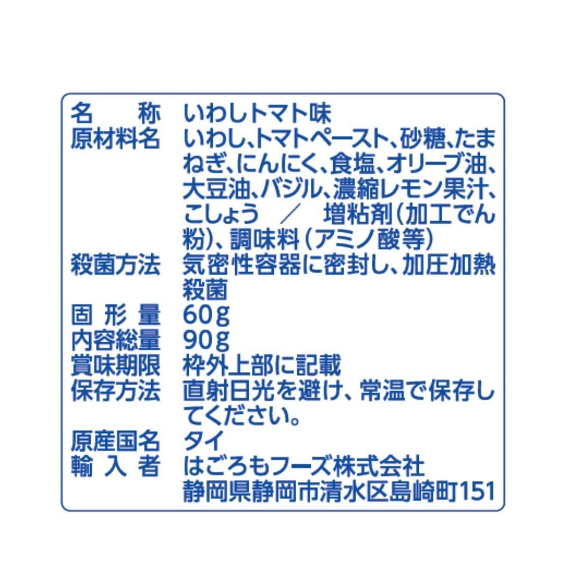 いわし、トマトペースト、砂糖、たまねぎ、にんにく、食塩、オリーブ油、大豆油、バジ ル、濃縮レモン果汁、こしょう / 増粘剤(加工でん粉)、調味料(アミノ酸等)